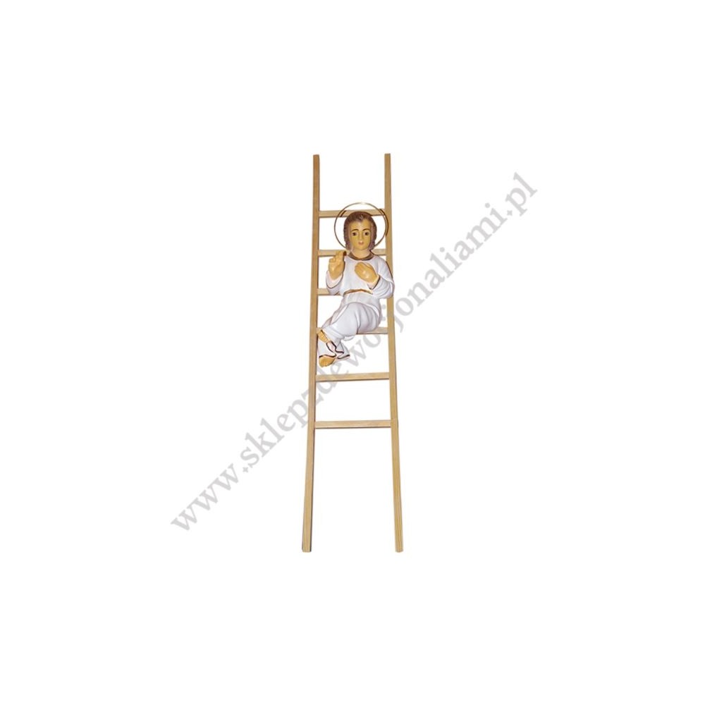 Figura żywiczna Dzieciątka Adwentowego o wysokości 32 cm na drewnianej drabince o wysokości 98 cm.