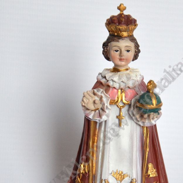 Figurka Dzieciątka Praskiego o wysokości 12 cm i szerokości 5.5 cm wykonana z tworzywa sztucznego.