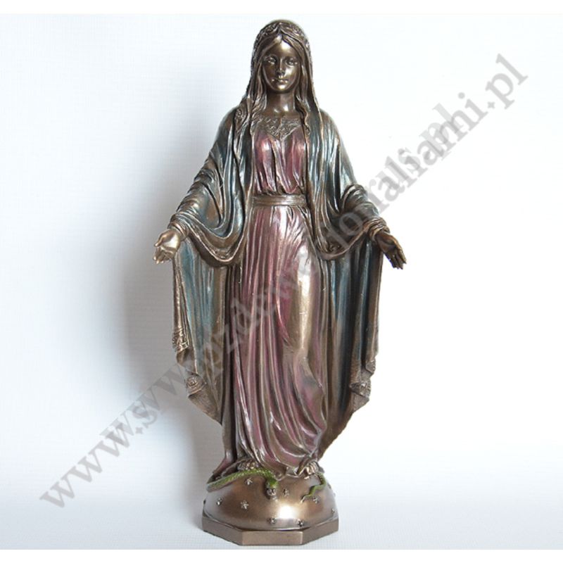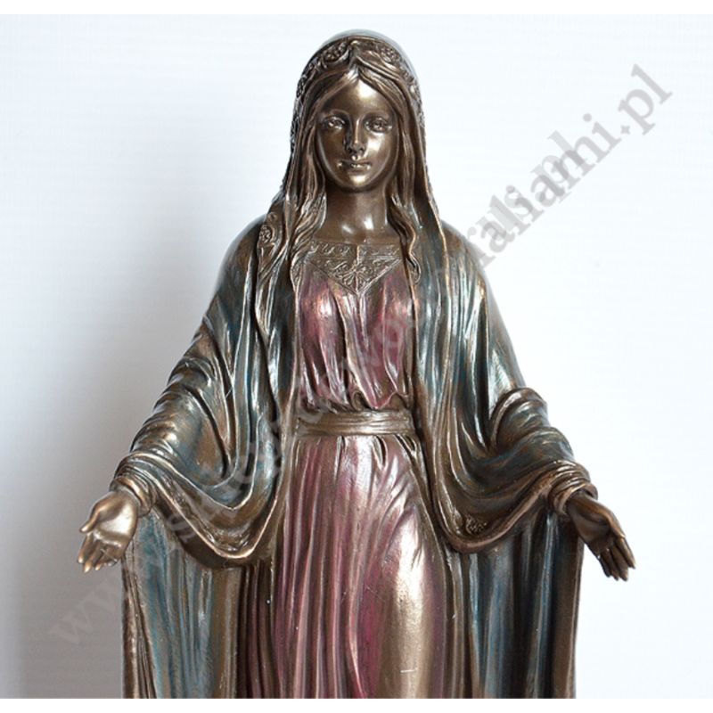 Figura Matki Bożej Niepokalanej o wysokości 25.5 cm wykonana z poliresingu czyli konglomeratu żywicy, mączki alabastrowej i ceramicznej, pokryta brązem.