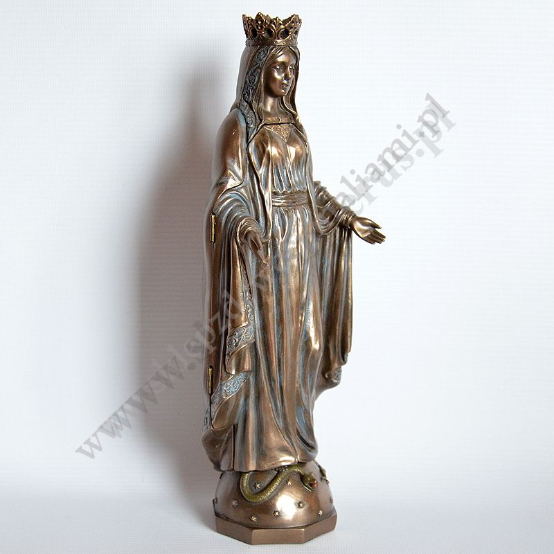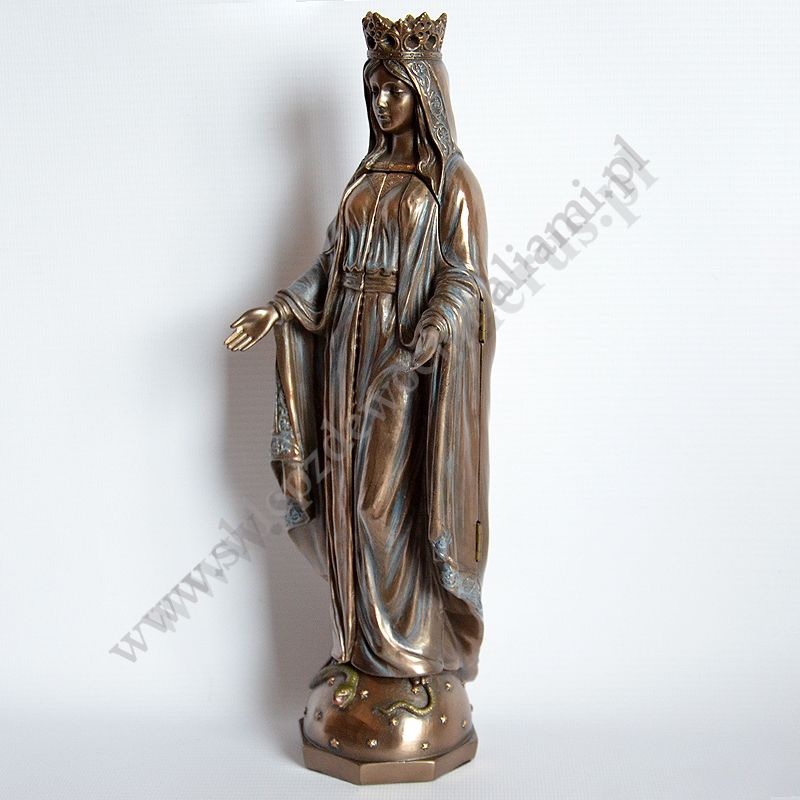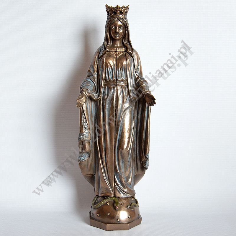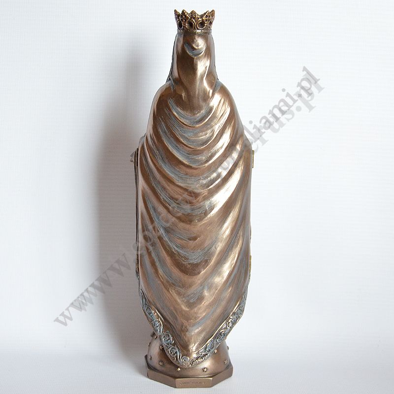 Figura Matki Bożej w postaci poliptyku, po otwarciu wizerunek Matki Bożej trzymającej Ciało Pana Jezusa. Wysokość 27.5 cm, szerokość 9.3 cm, szerokość po otwarciu 17 cm. Wykonana z poliresingu czyli konglomeratu żywicy, mączki alabastrowej i ceramicznej, pokryta brązem.