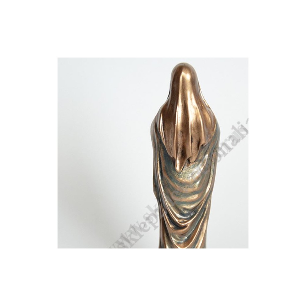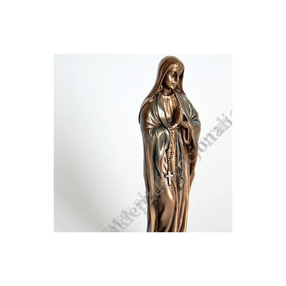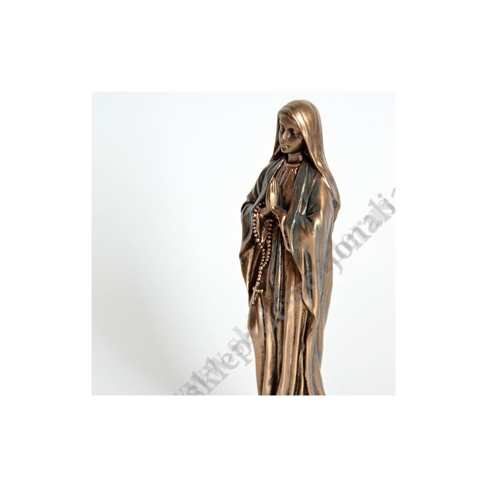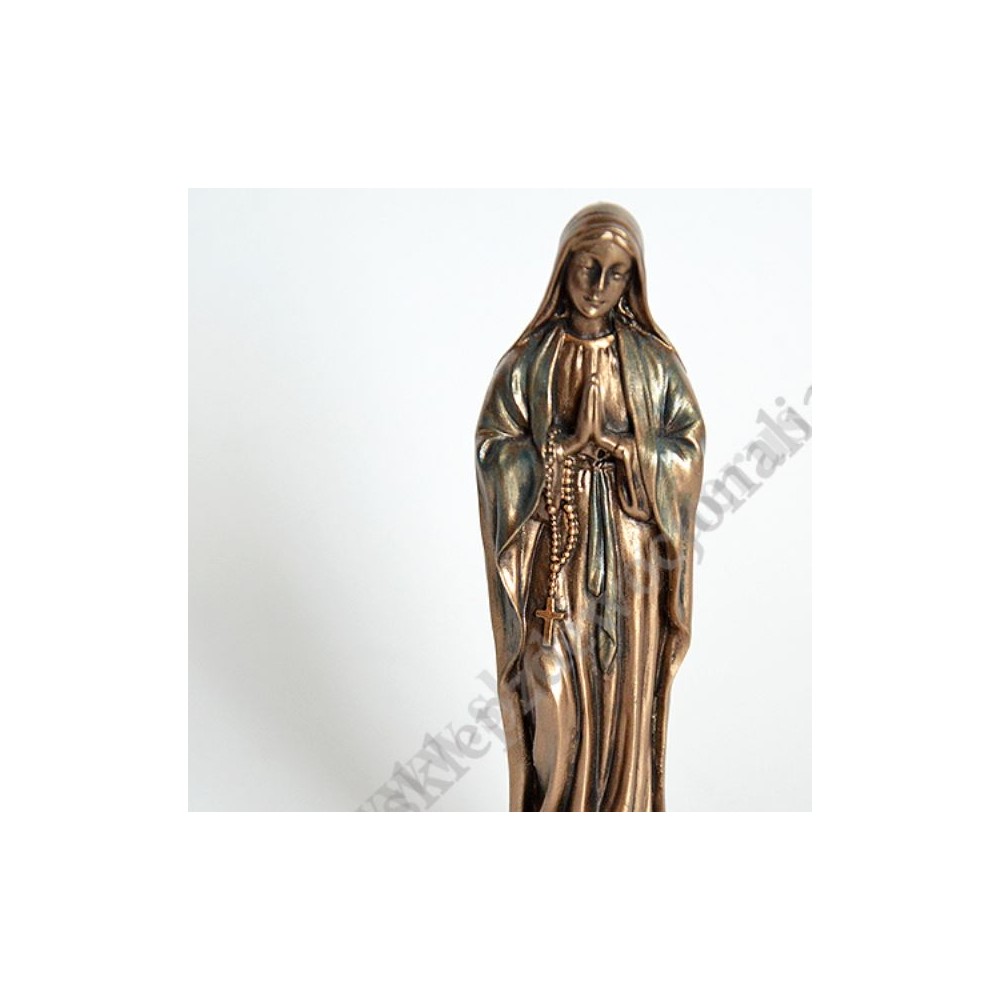 Figura Matki Bożej z Lourdes o wysokości 8.7 cm wykonana z poliresingu czyli konglomeratu żywicy, mączki alabastrowej i ceramicznej, pokryta brązem.