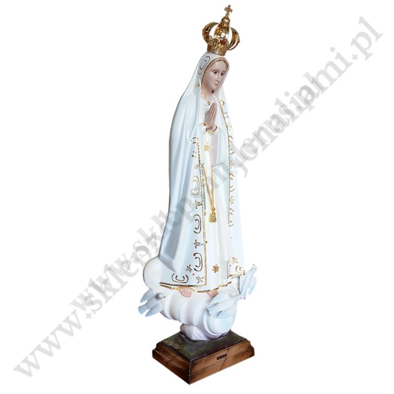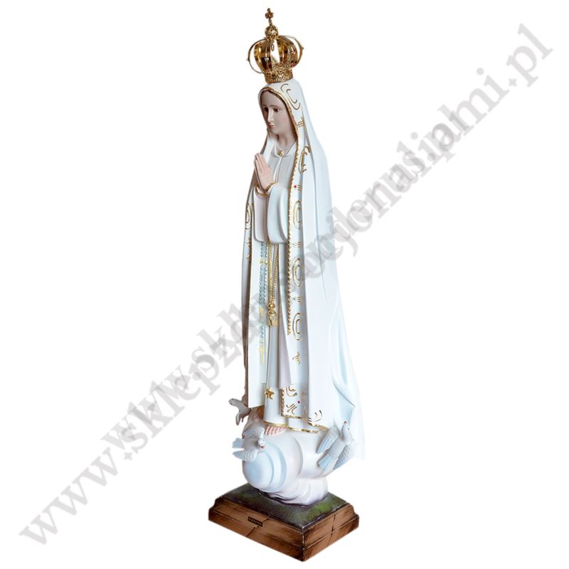 Figura Matki Bożej Fatimskiej sprowadzanej z Portugalii, wykonana z żywicy syntetycznej, charakteryzuje się pięknym wykonaniem oraz malowaniem, oczy wykonane są ze szkła przez co wyglądają jak żywe.