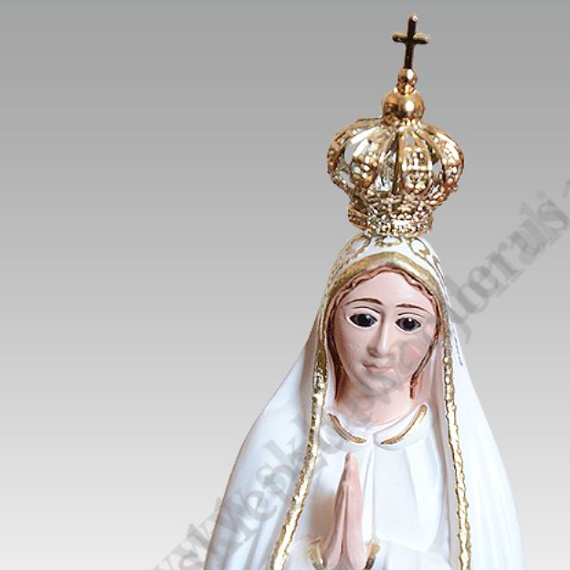 Figura Matki Bożej Fatimskiej sprowadzanej z Portugalii, wykonana z żywicy syntetycznej, charakteryzuje się pięknym wykonaniem oraz malowaniem, oczy wykonane są ze szkła przez co wyglądają jak żywe.
