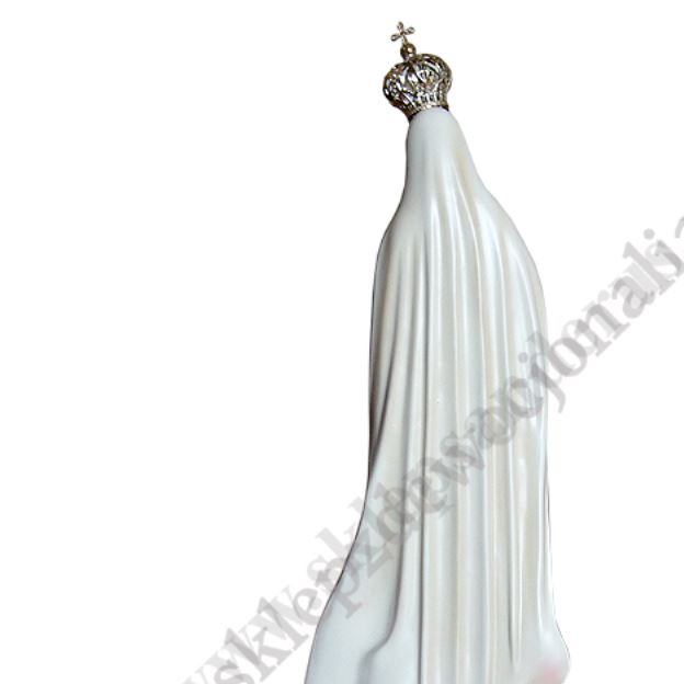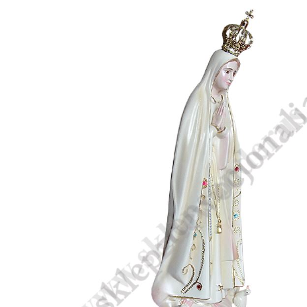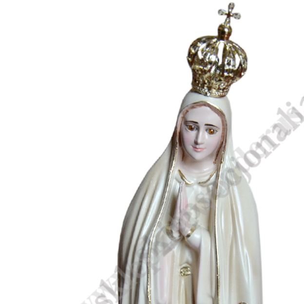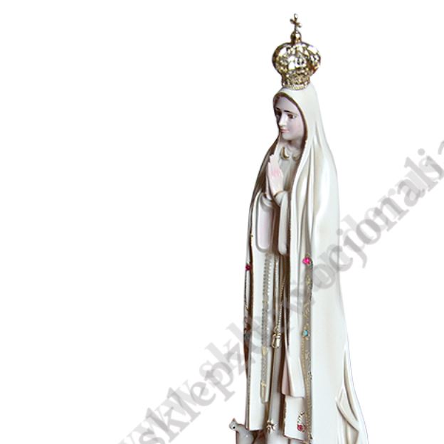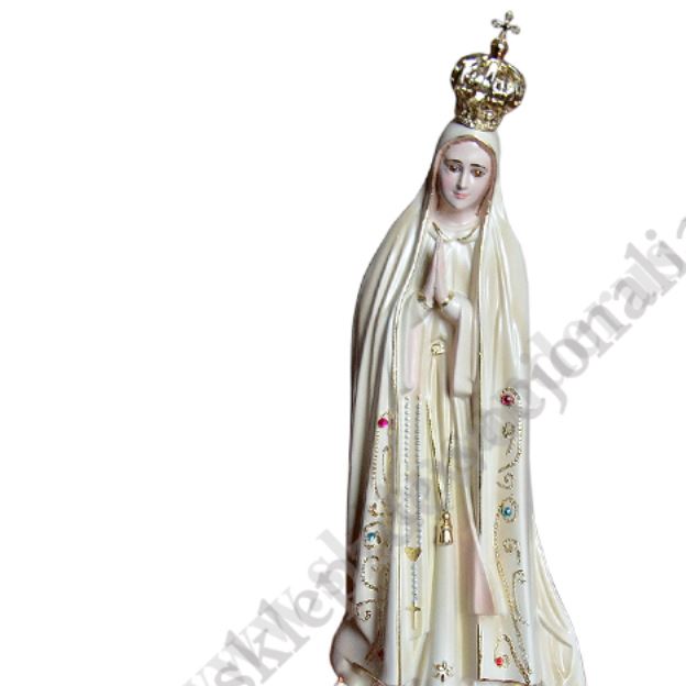 Figura Matki Bożej Fatimskiej sprowadzanej z Portugalii, wykonana z żywicy syntetycznej, charakteryzuje się pięknym wykonaniem oraz malowaniem, oczy wykonane są ze szkła przez co wyglądają jak żywe.