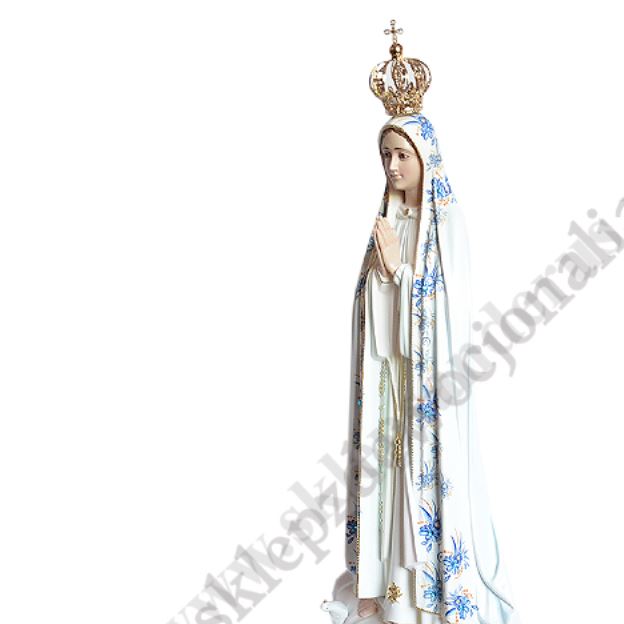 Figura Matki Bożej Fatimskiej sprowadzanej z Portugalii, wykonana z żywicy syntetycznej, charakteryzuje się pięknym wykonaniem oraz oryginalnym malowaniem, oczy wykonane są ze szkła przez co wyglądają jak żywe.