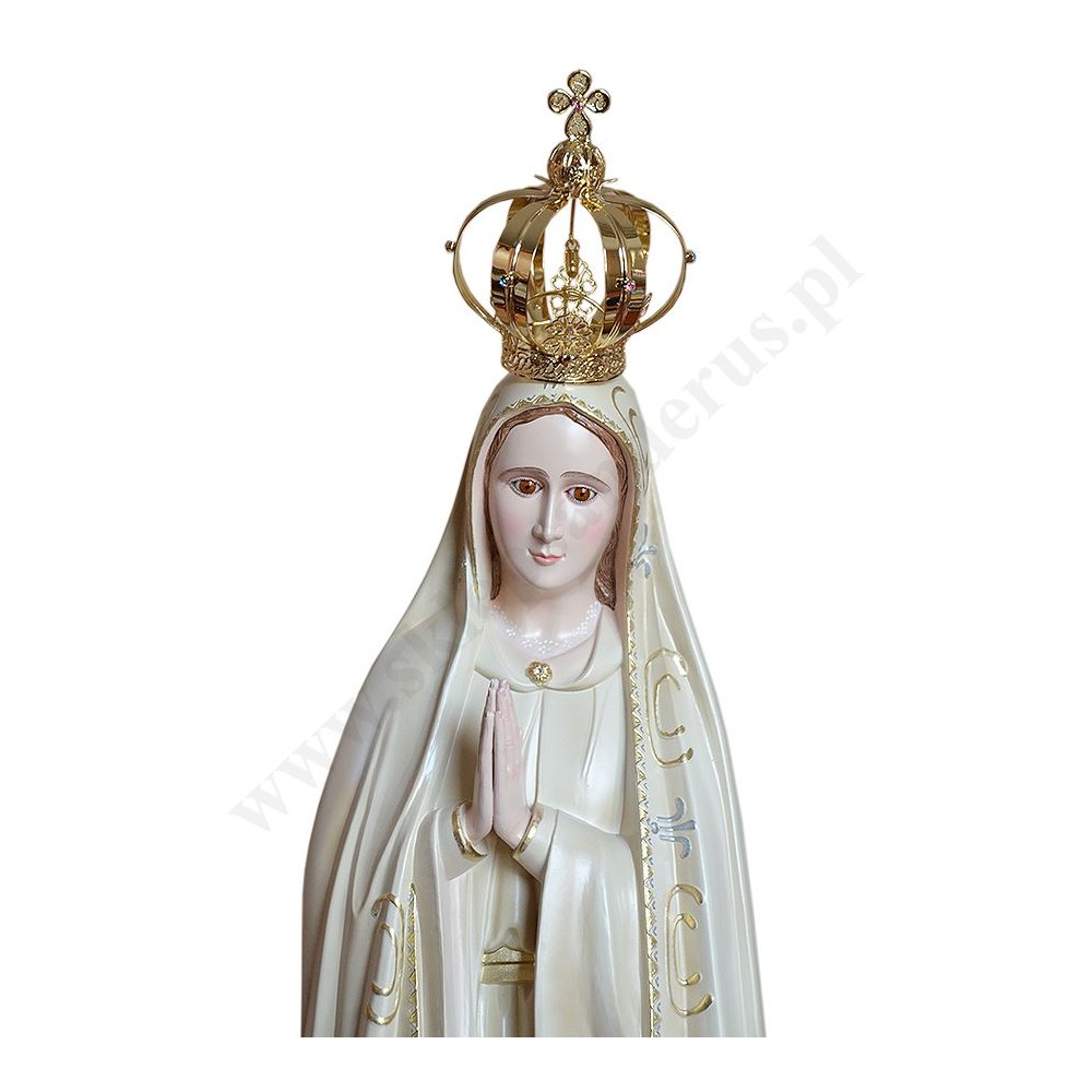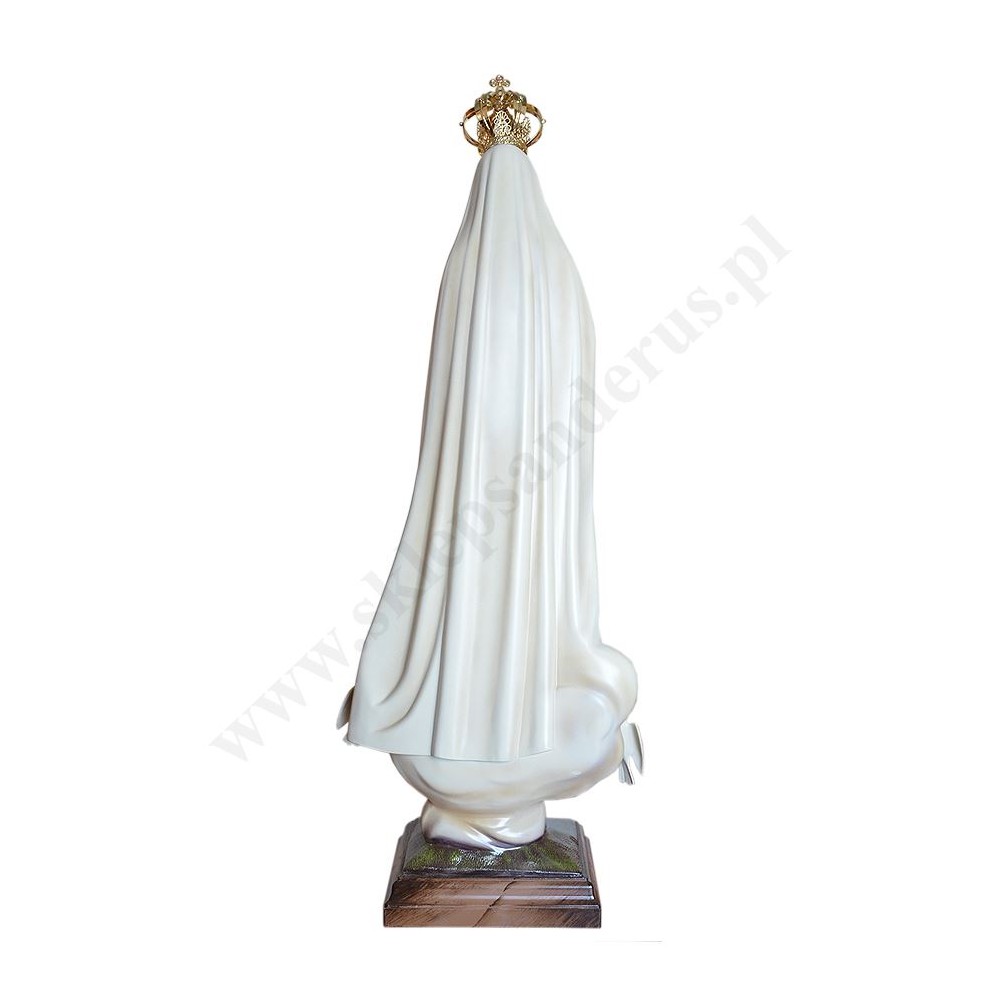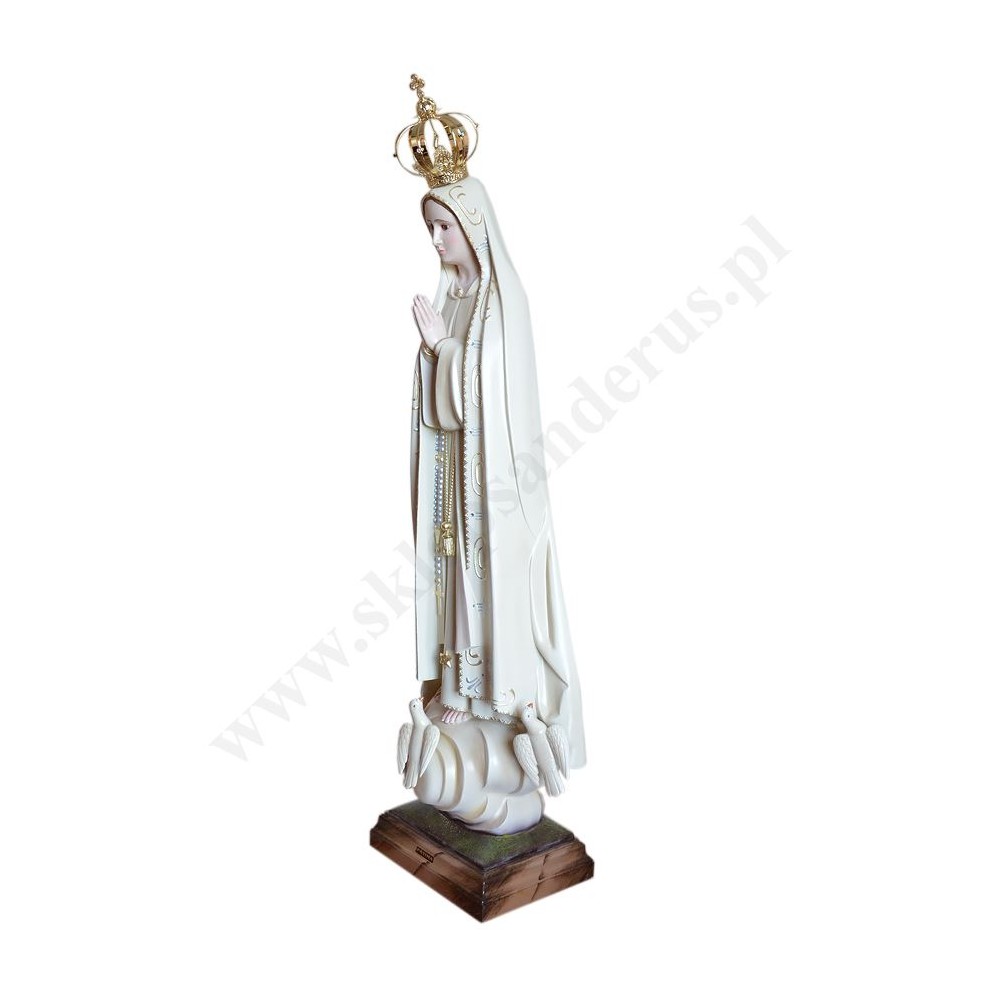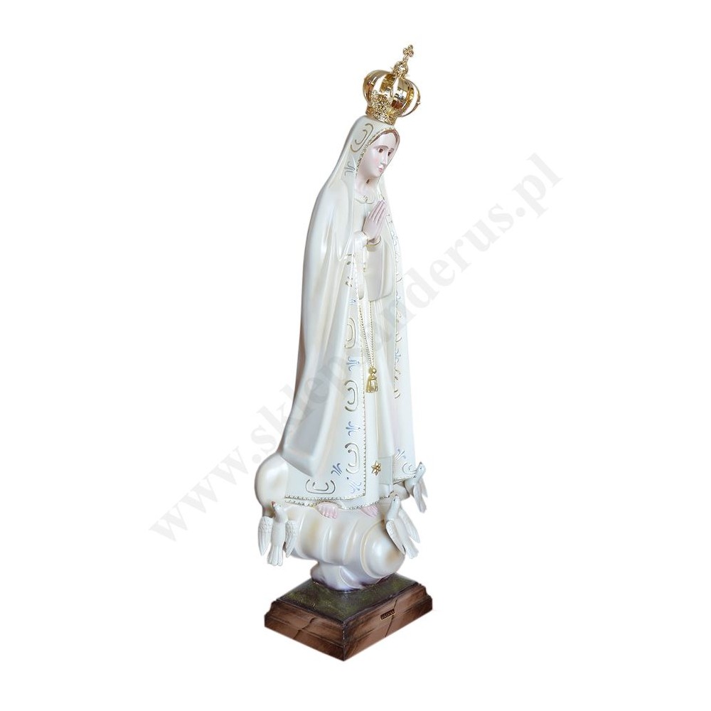 Figura Matki Bożej Fatimskiej sprowadzanej z Portugalii, wykonana z żywicy syntetycznej, charakteryzuje się pięknym wykonaniem oraz malowaniem, oczy wykonane są ze szkła przez co wyglądają jak żywe.