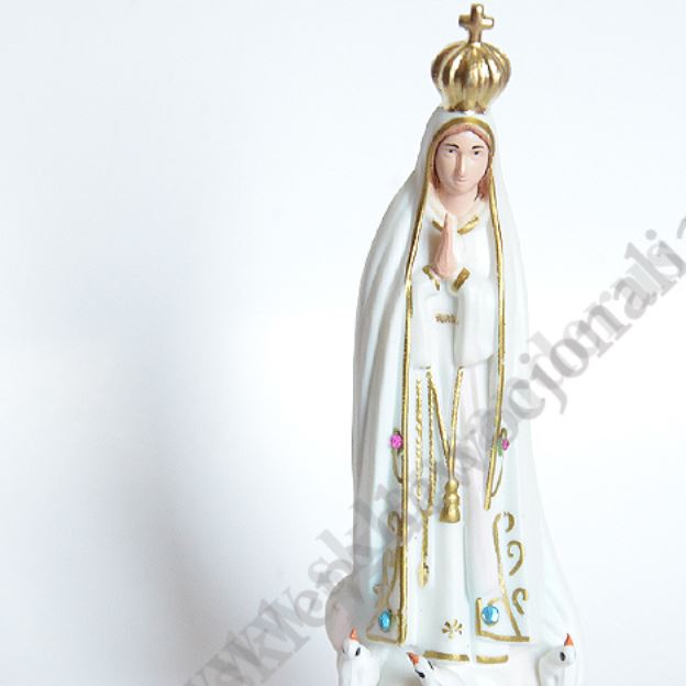 Figura Matki Bożej Fatimskiej sprowadzanej z Portugalii, wykonana z żywicy syntetycznej, charakteryzuje się pięknym wykonaniem oraz malowaniem.