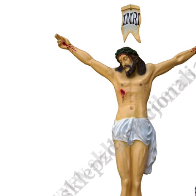 Korpus Chrystusa na krzyż - figura żywiczna w kolorze srebrnej o przekątnej 125 cm, rozstaw rąk 80 cm. Na zdjęciu jest zaprezenotwane zdjęcie figury w wersji wielobarwnej, natomiast w rogu zdjęcia prezentujemy inną figurę w kolorze srebrnym aby poglądowo przedstawić jak będzie wyglądał korpus w tym wariancie kolorystycznym.