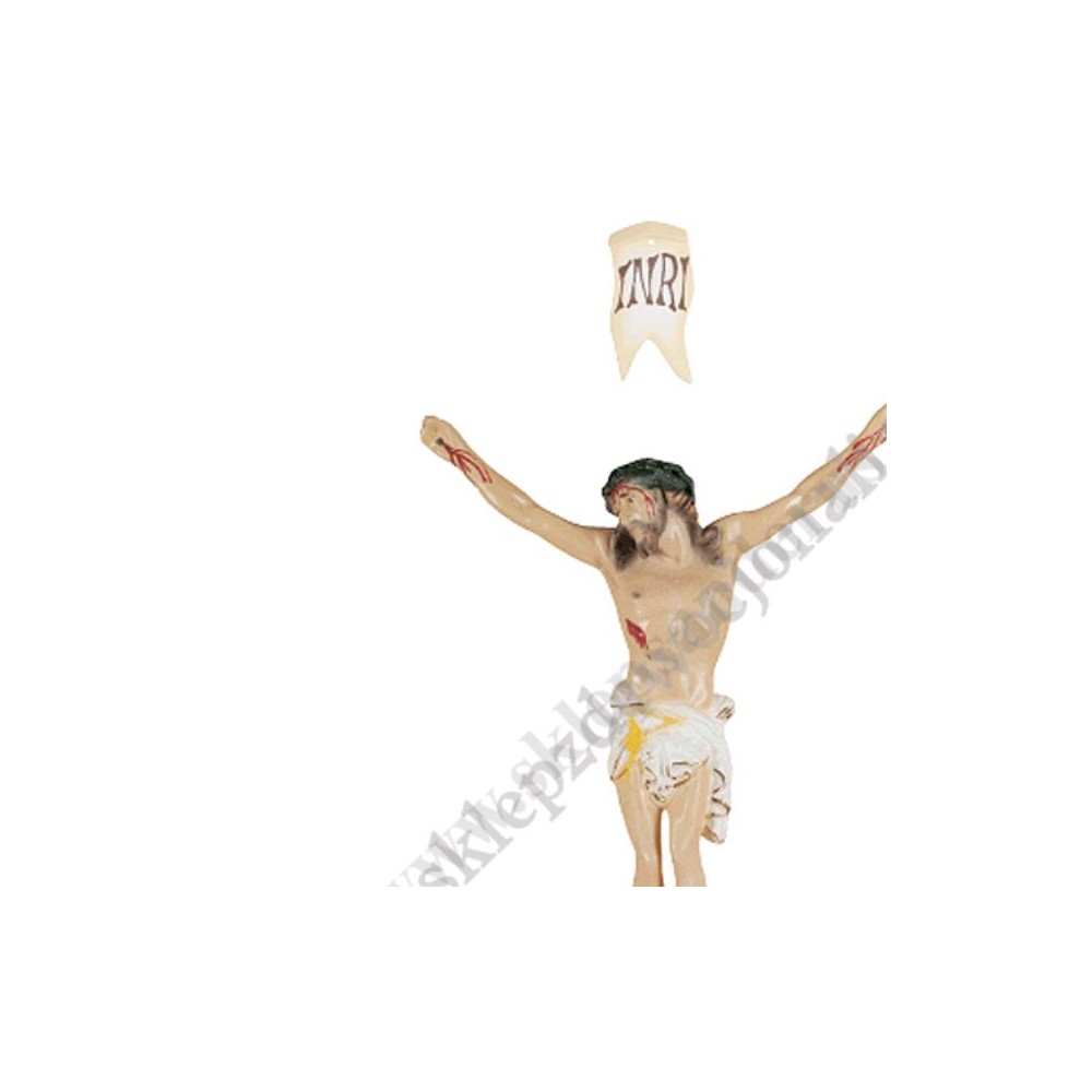 Korpus Chrystusa na krzyż - figura żywiczna w kolorze ecru o przekątnej 33 cm, rozstaw rąk 26 cm. Na zdjęciu jest zaprezentowane zdjęcie figury w wersji wielobarwnej, natomiast w rogu zdjęcia prezentujemy inną figurę w kolorze ecru aby poglądowo przedstawić jak będzie wyglądał korpus w tym wariancie kolorystycznym.