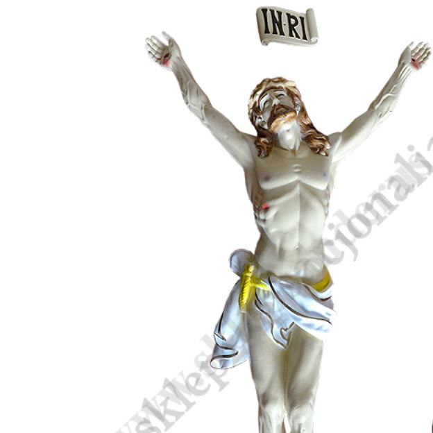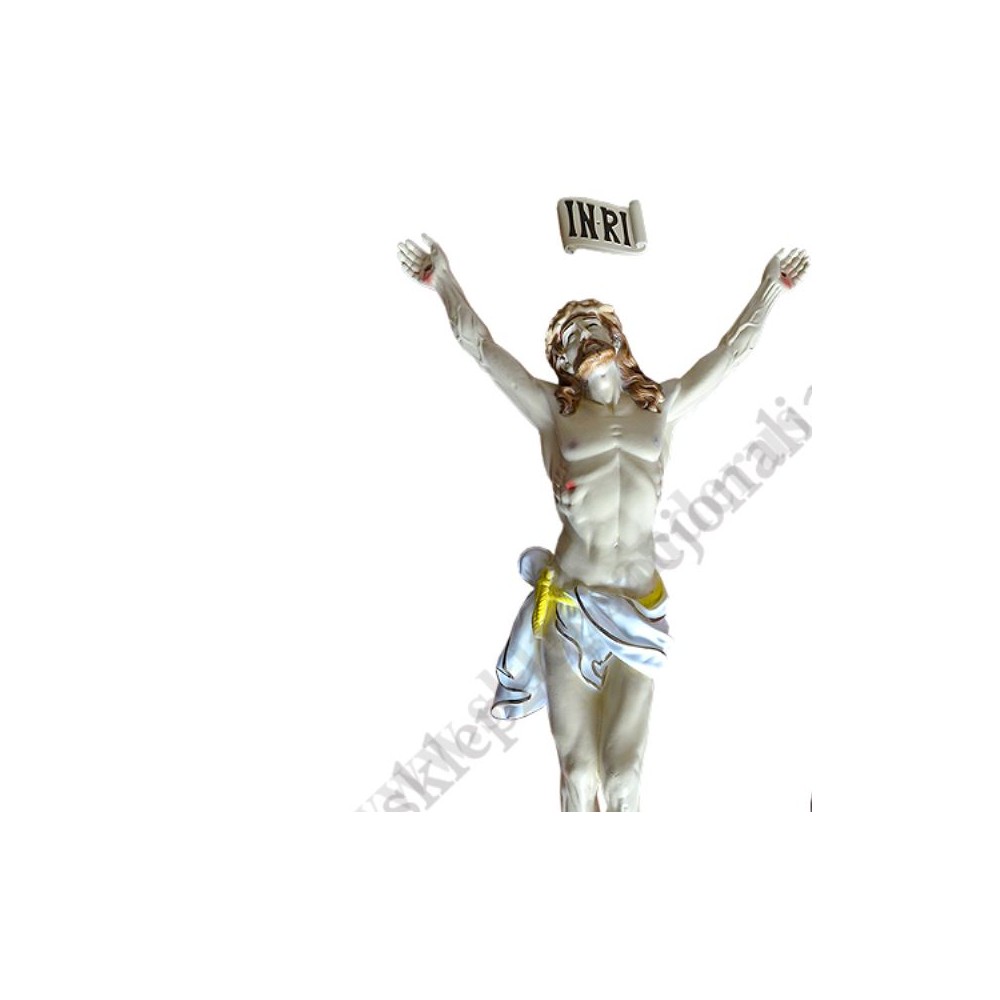 Korpus Chrystusa na krzyż - figura żywiczna w kolorze patyny złotej o przekątnej 82 cm, rozstaw rąk 40 cm, wysokość od rąk do nóg 79 cm.. Na zdjęciu jest zaprezentowane zdjęcie figury w wersji wielobarwnej, natomiast w rogu zdjęcia prezentujemy inną figurę w kolorze patyny złotej aby poglądowo przedstawić jak będzie wyglądał korpus w tym wariancie kolorystycznym.