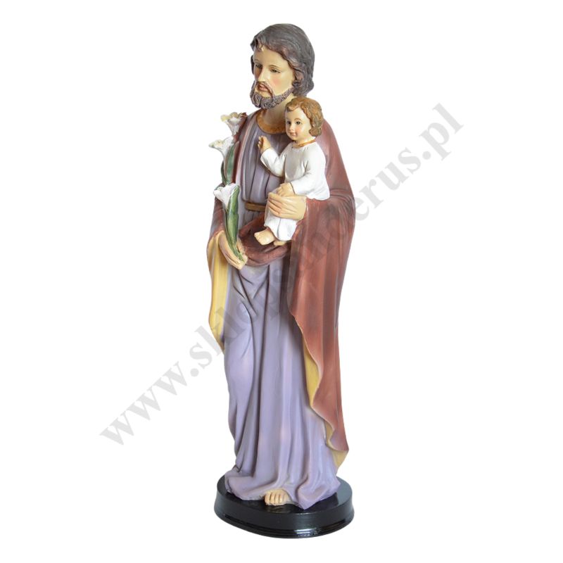 Figurka Świętego Józefa wykonana z żywicy o wysokości 30 cm i szerokości 9 cm.
