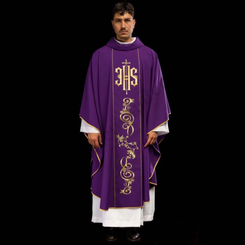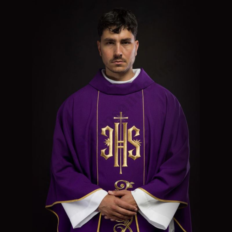 Ornat wykonany jest z wysokiej jakości tkaniny, ozdobionej haftem wykonanym złotą nicią, przedstawiającym symbol Eucharystii, symbol IHS. Dodatkowo brzegi ornatu wykończone są złotą satynową lamówką, która idealnie komponuje się ze złotym haftem symbolu IHS. Ornat dostępny jest we wszystkich kolorach liturgicznych.