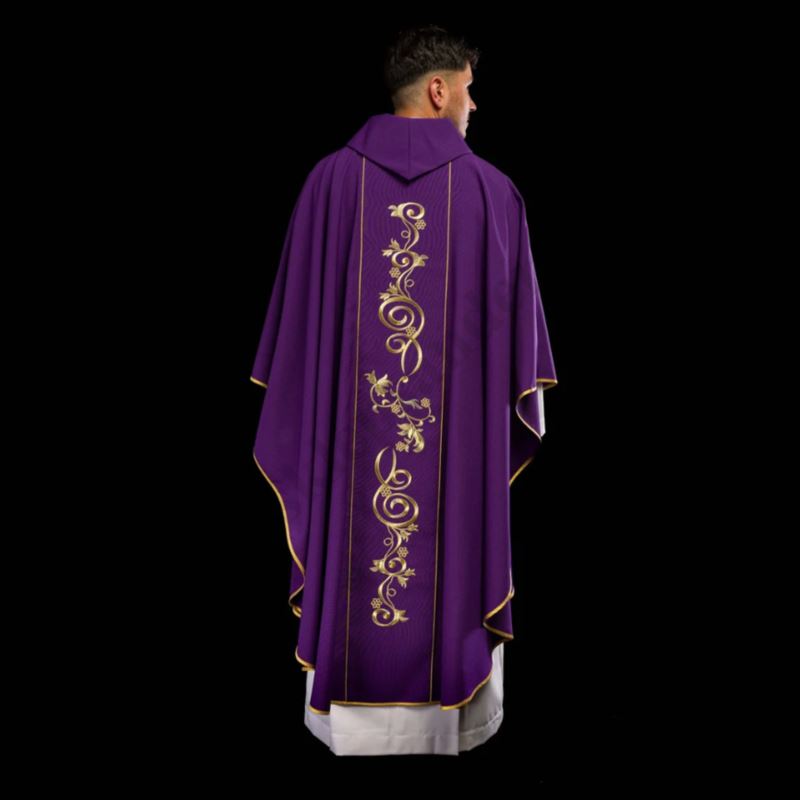 - Ornat jest dodatkowo ozdobiony haftem wykonanym złotą nicią, przedstawiającym symbol IHS. Złota lamówka zastosowana do wykończenia szaty zapobiega strzępieniu się materiału.