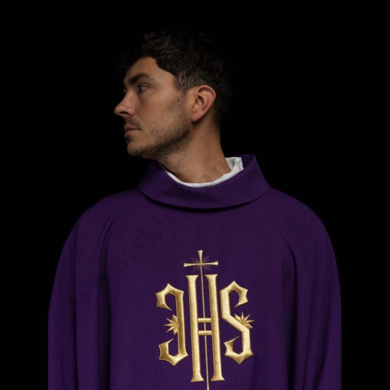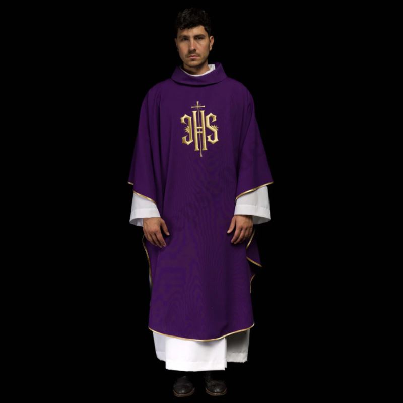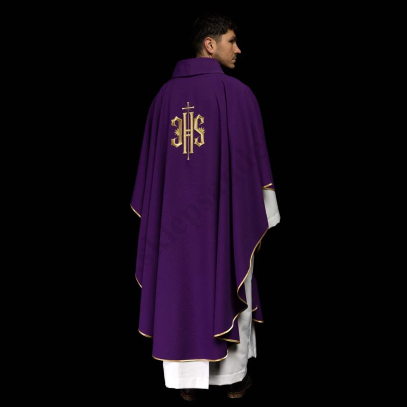 Ornat wykonany jest z wysokiej jakości tkaniny, ozdobionej haftem wykonanym złotą nicią, przedstawiającym symbol Eucharystii, symbol IHS. Dodatkowo brzegi ornatu wykończone są złotą satynową lamówką, która idealnie komponuje się ze złotym haftem...