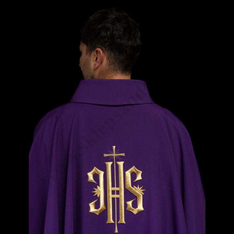 - materiał wykonany jest w 100% z polietylenu (PE) . Ornat dodatkowo zdobi haft wykonany złotą nicią, przedstawiający symbol IHS. Złota lamówka zastosowana do wykończenia szaty zapobiega strzępieniu się materiału.