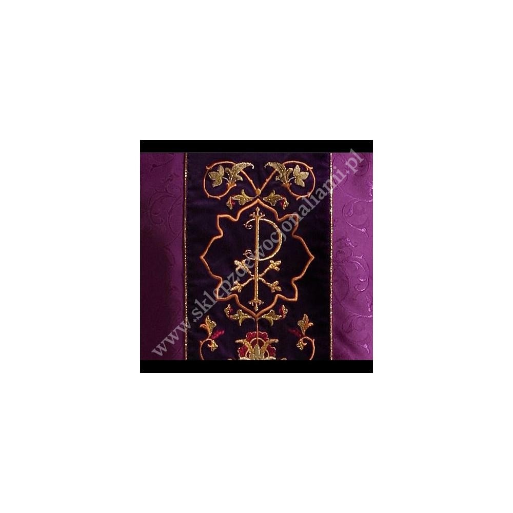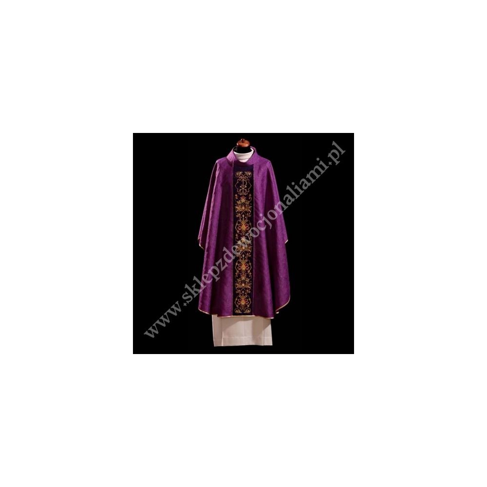 Elegancki i bardzo bogato haftowany ornat uszyty z ozdobnej tkaniny. Ornat uszyty w stylu monastycznym ze stułą wewnętrzną