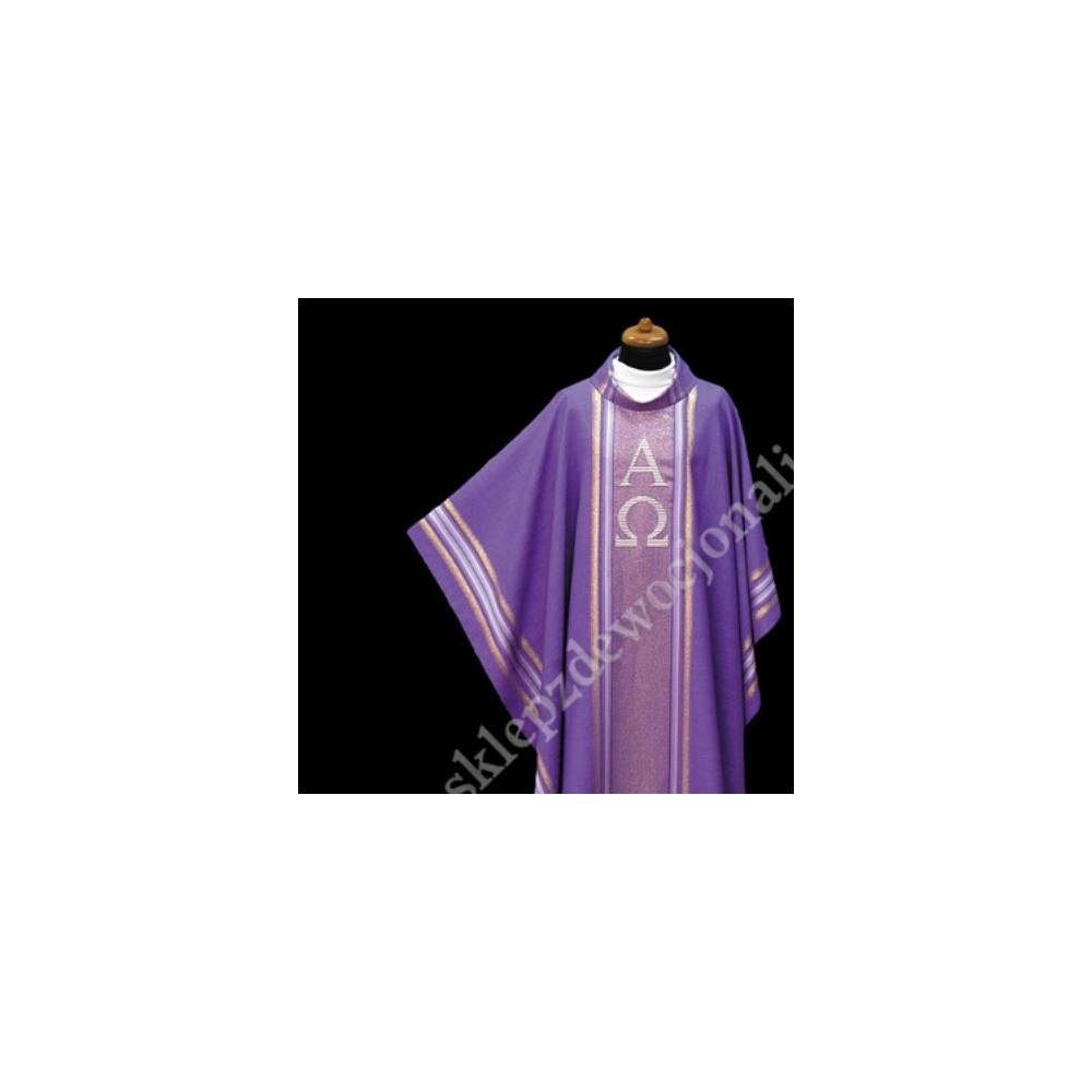 Ornat uszyty z nowoczesnej tkaniny z wplecionymi nićmi w kolorze złota i fioletu, na środku haft. Ornat uszyty w stylu monastycznym ze stułą wewnętrzną