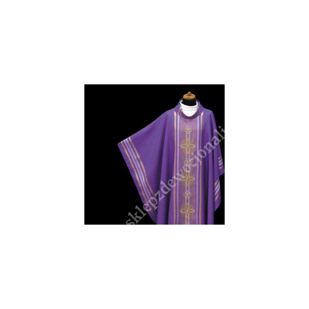 Ornat uszyty z lekkiej tkaniny z wplecionymi nićmi w kolorze złota i fioletu.Na środku haft w kolorze złota