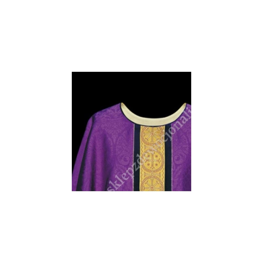 Ornat bez kołnierza ze stułą wewnętrzną. Szata liturgiczna ozdobiona galonem naszytym na aksamit.