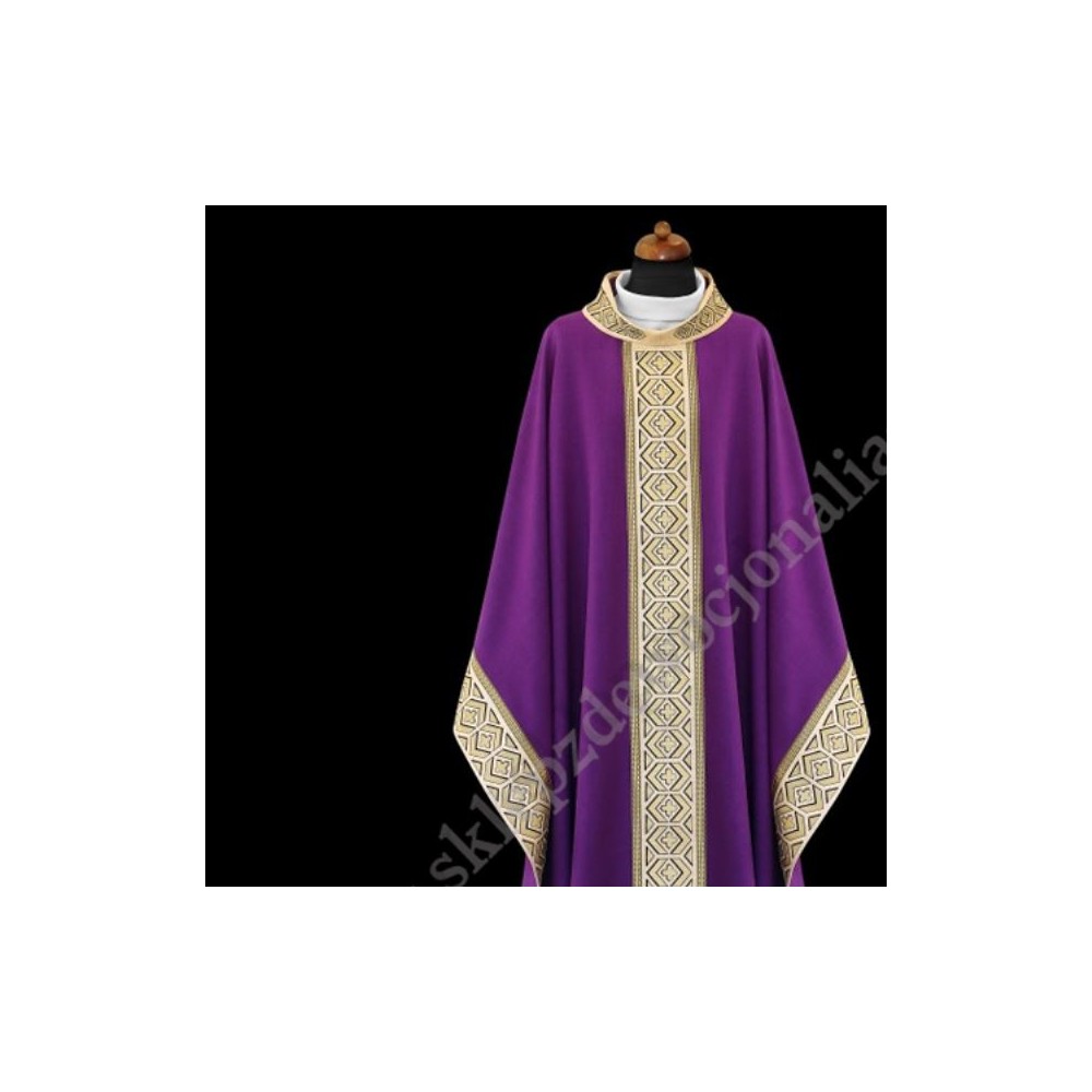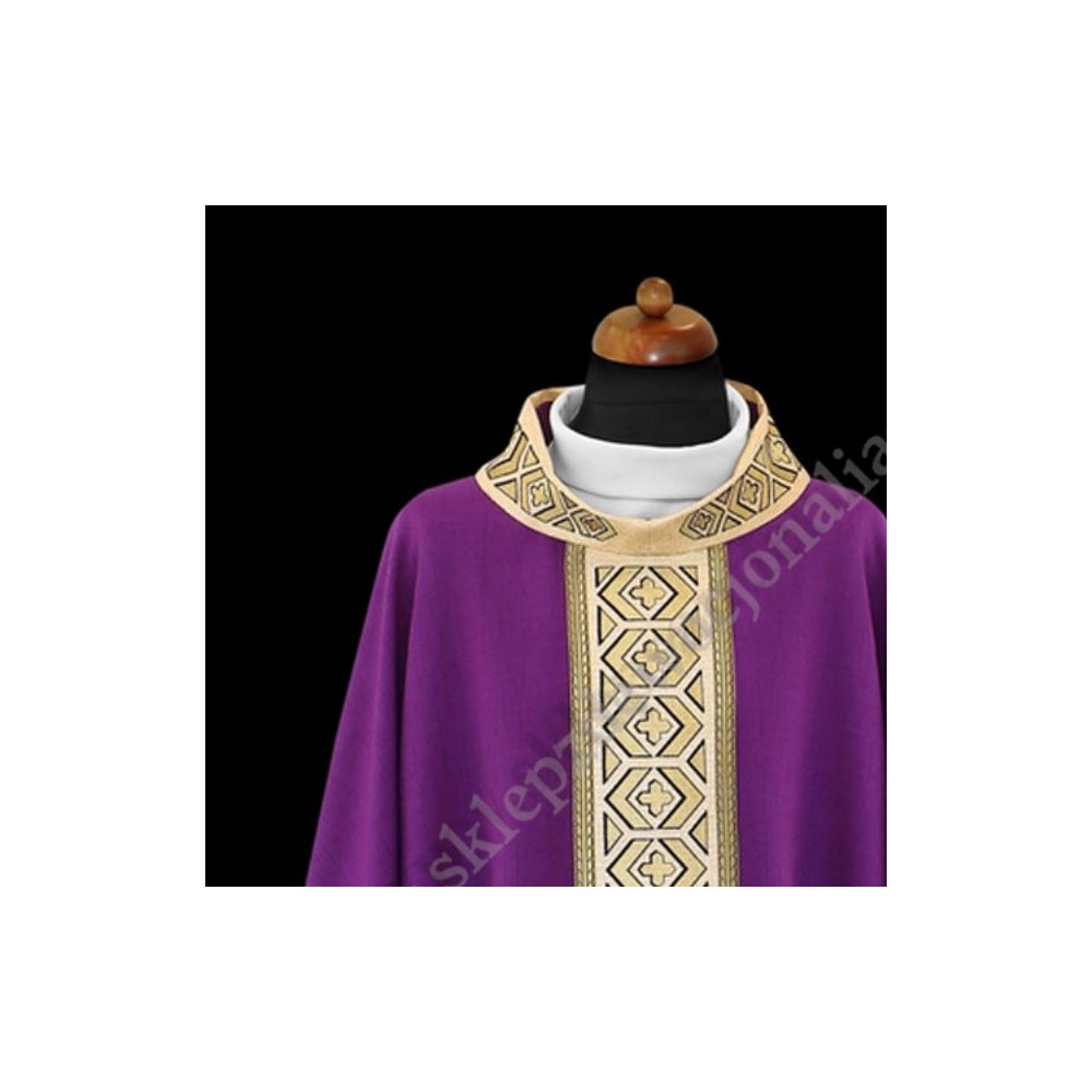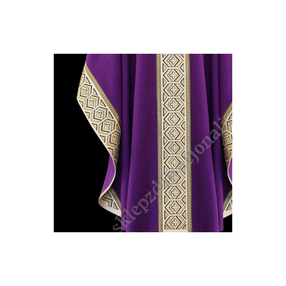 Elegancki ornat w stylu monastycznym z haftowanym kołnierzem i bokami ze stułą wewnętrzną. Szata uszyta z lekkiej tkaniny z bogatym haftem na pasie i ozdobiona złotą pasmanterią.