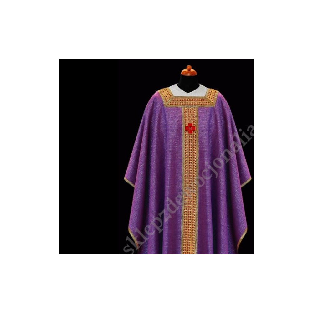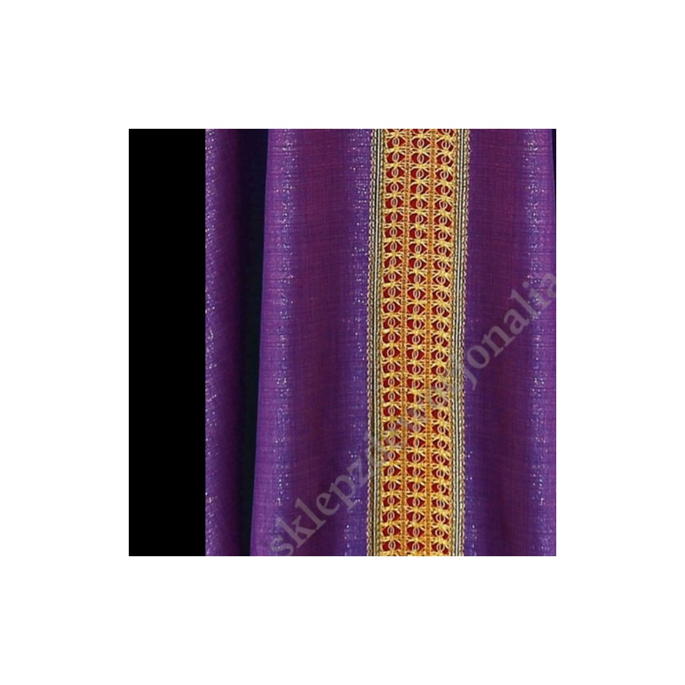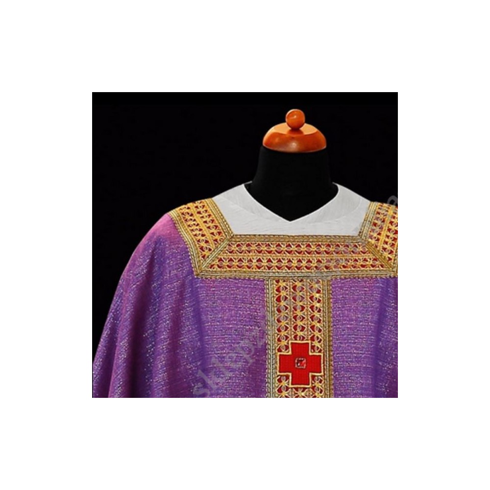 Ornat uszyty z delikatnej tkaniny z przetykaną złoto-srebrną nicią, ozdobiony ażurową taśmą i ręcznie naszywanym krzyżem. Krzyż na ornacie ozdobiony kamieniem. Ornat ze stułą wewnętrzną.