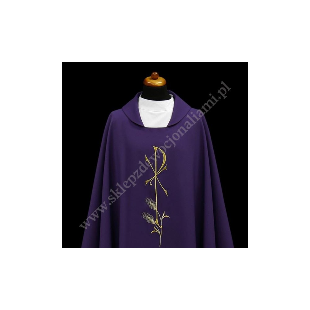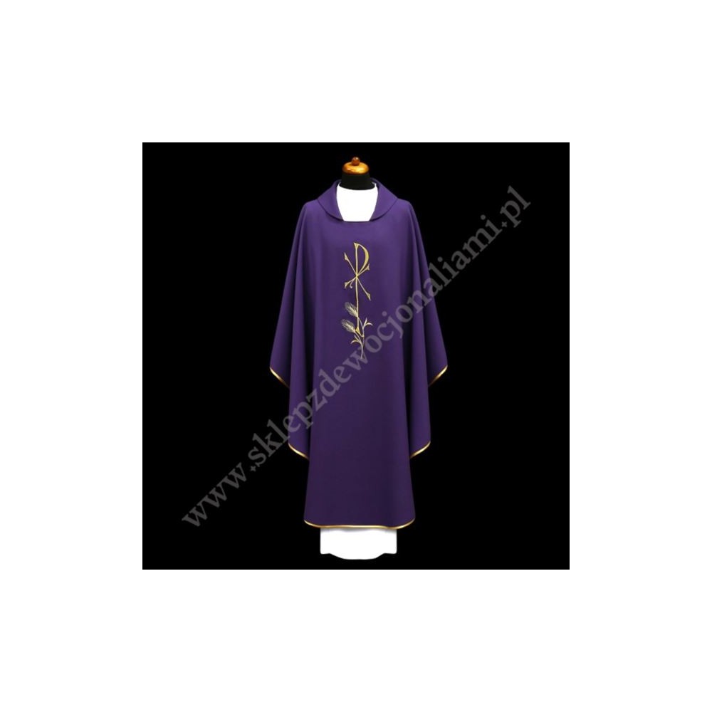 Ornat wykonany z lekkiej tkaniny ozdobiony haftem. Całość wykończona złotą, atłasową lamówką.