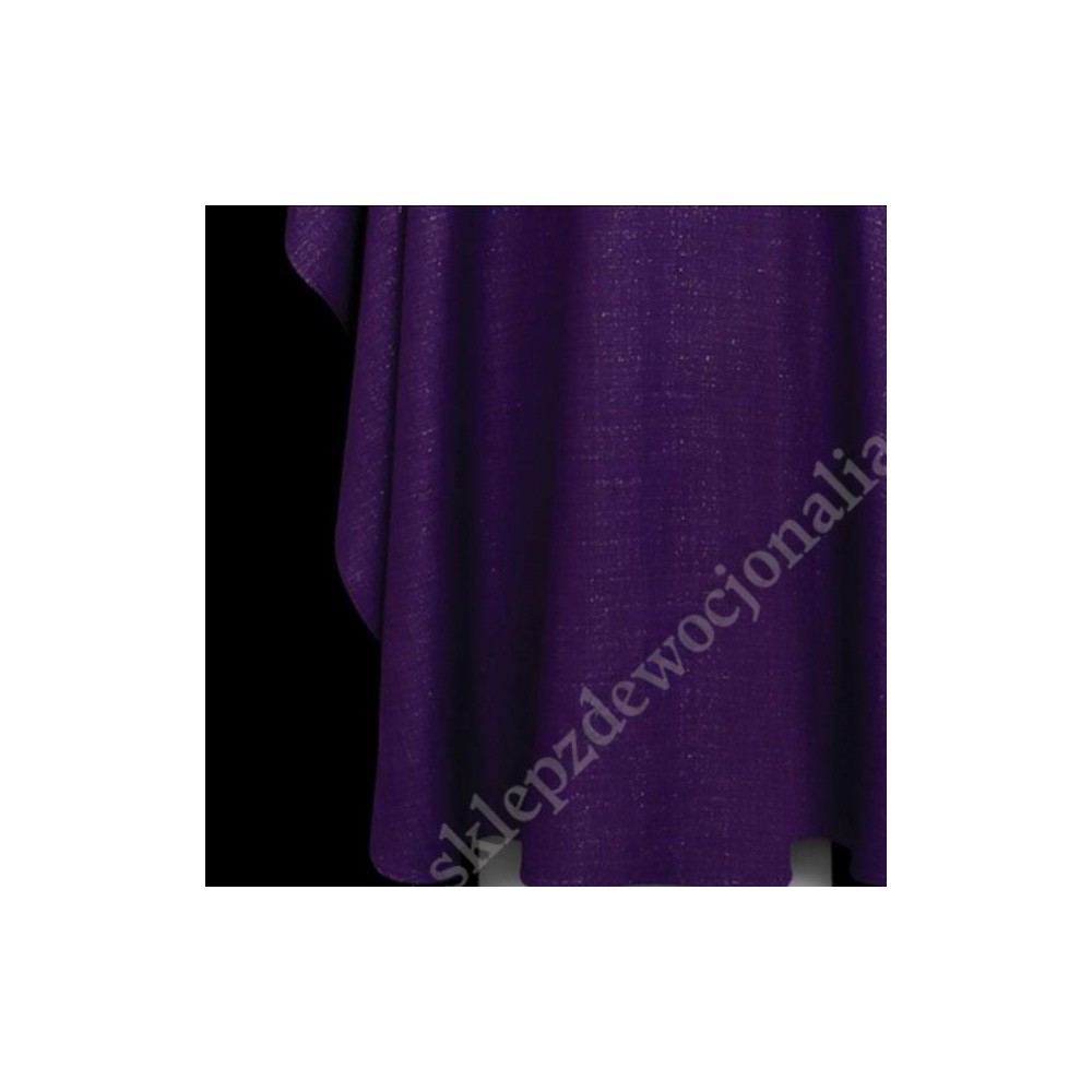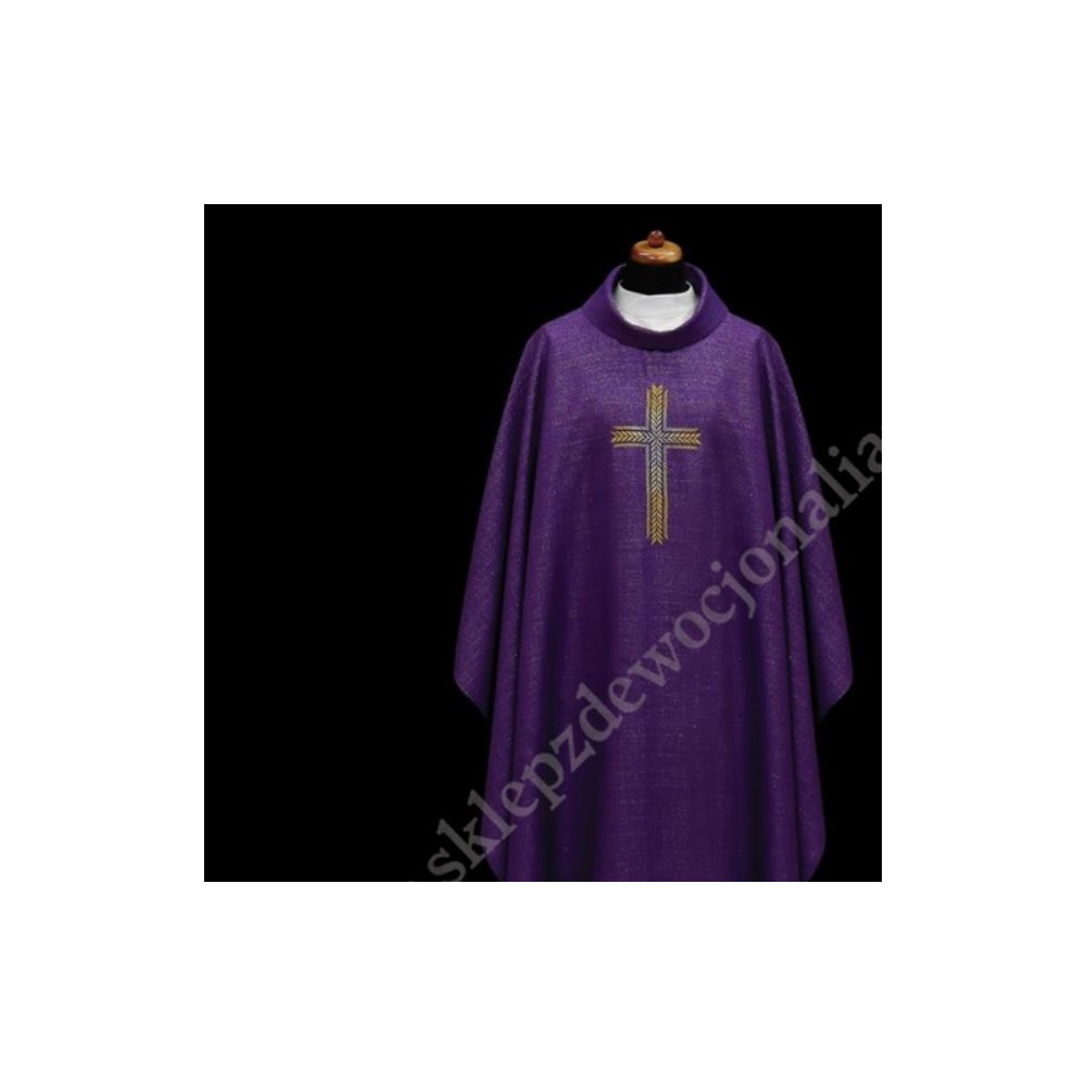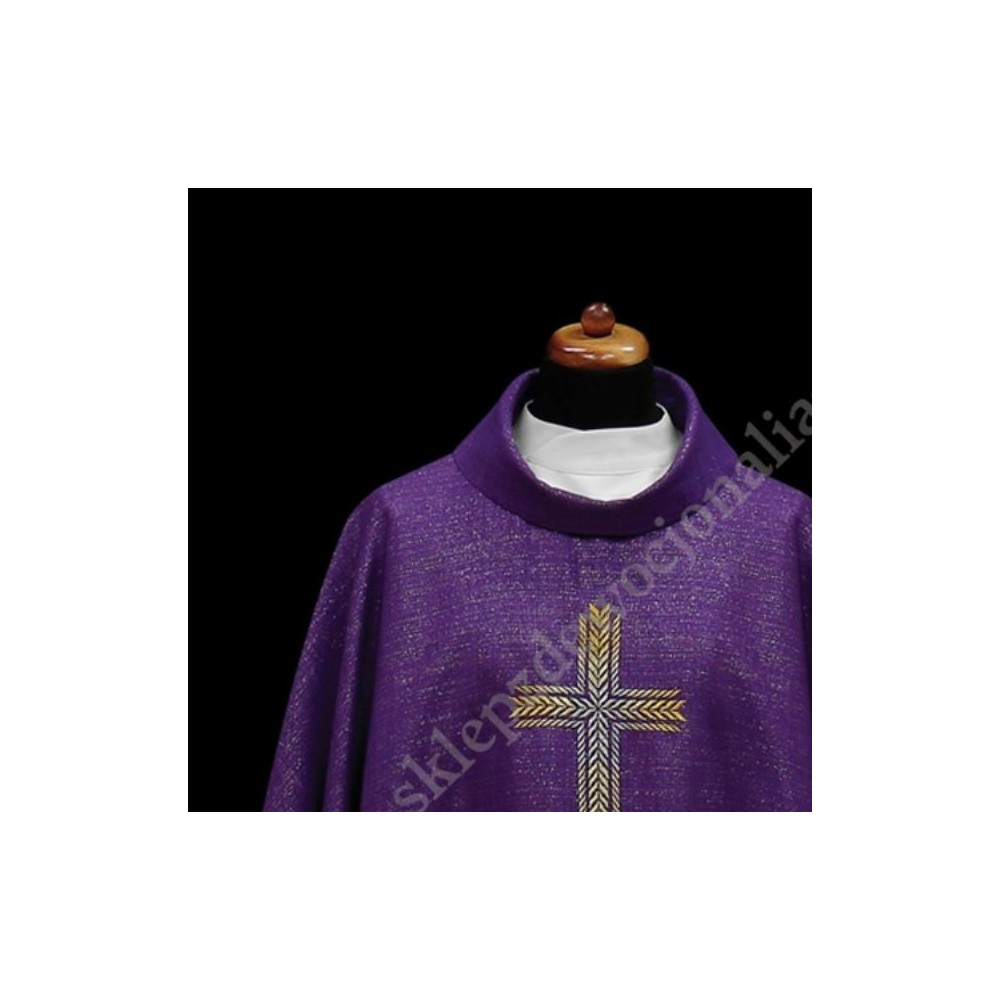 Ornat haftowany wykonany z tkaniny z przetykaną srebrną nicią. Tył ornatu- haftowany krzyż.