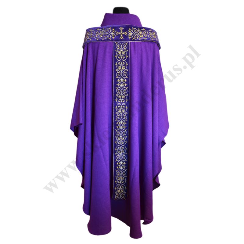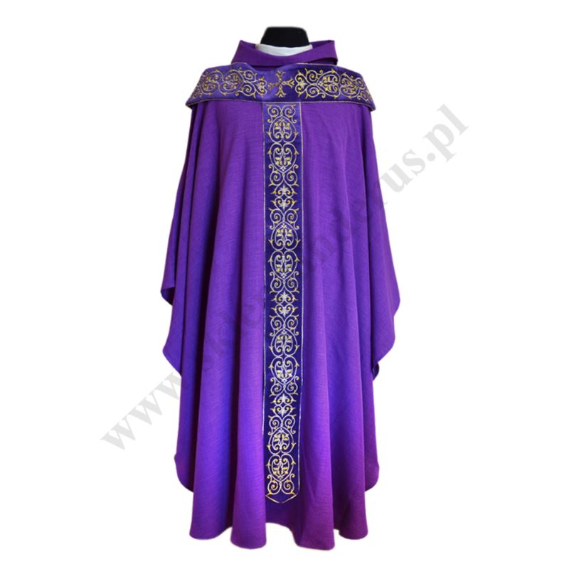 Ornat fioletowy szalowy uszyty z lekkiej tkaniny ozdobiony haftowanym nakładanym paliuszem. Bogato haftowany złotym ornamentem paliusz został uszyty z aksamitu. Paliusz ozdobiony dodatkowo haftowanym krzyżem. W komplecie stuła wewnętrzna. Szata liturgiczna idealna dla uroczystych ceremonii. Istnieje możliwość zamówienia ornatu z paliuszem we wszystkich kolorach liturgicznych.