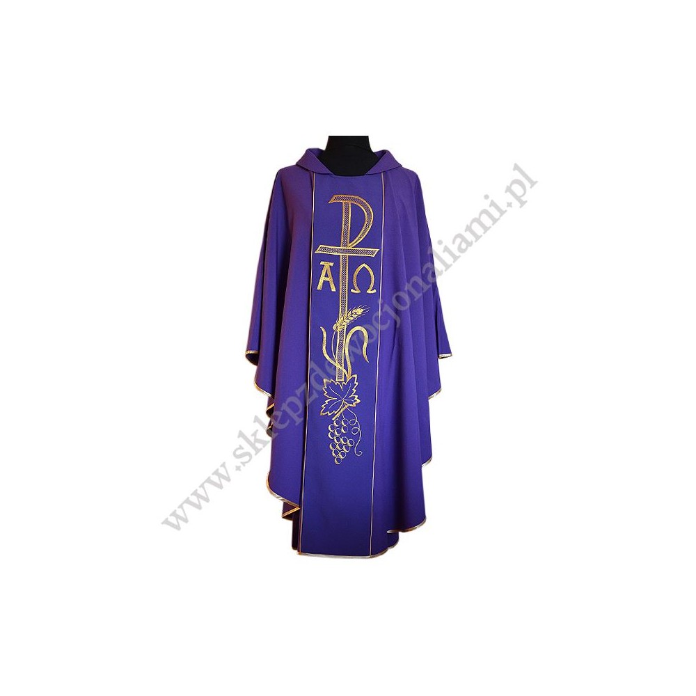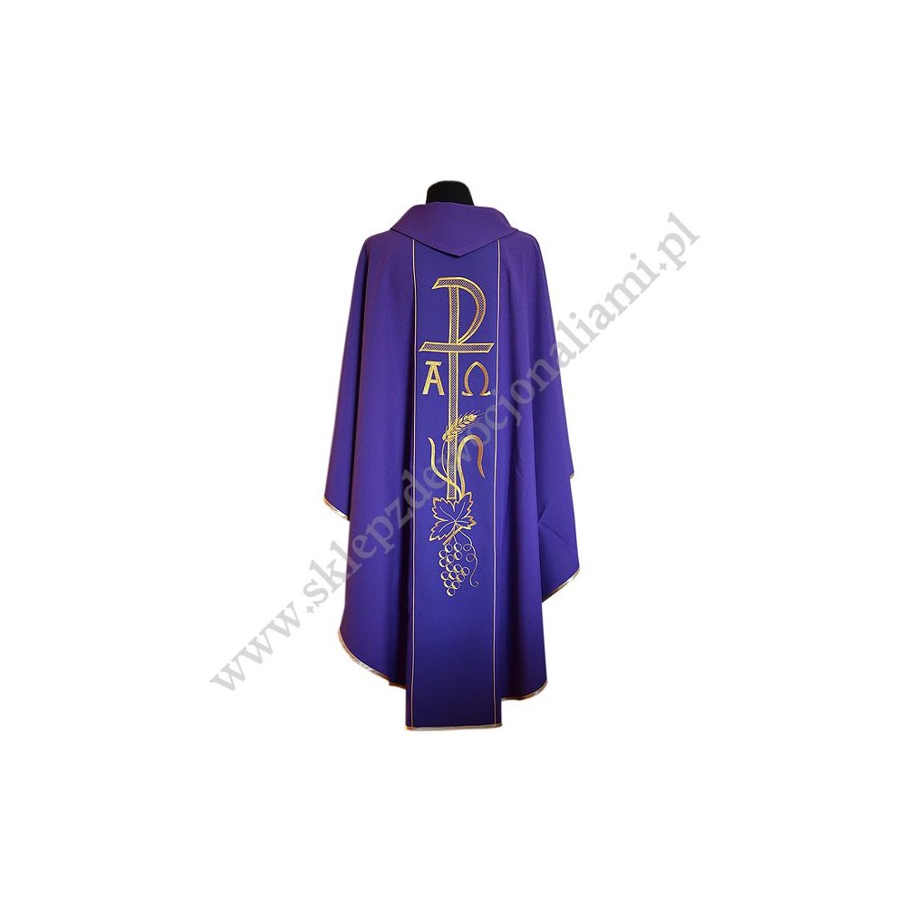 Ornat z pasami haftowanymi komputerowo. Wykonany z lekkiego i przyjemnego w dotyku materiału. W komplecie stuła wewnętrzna.