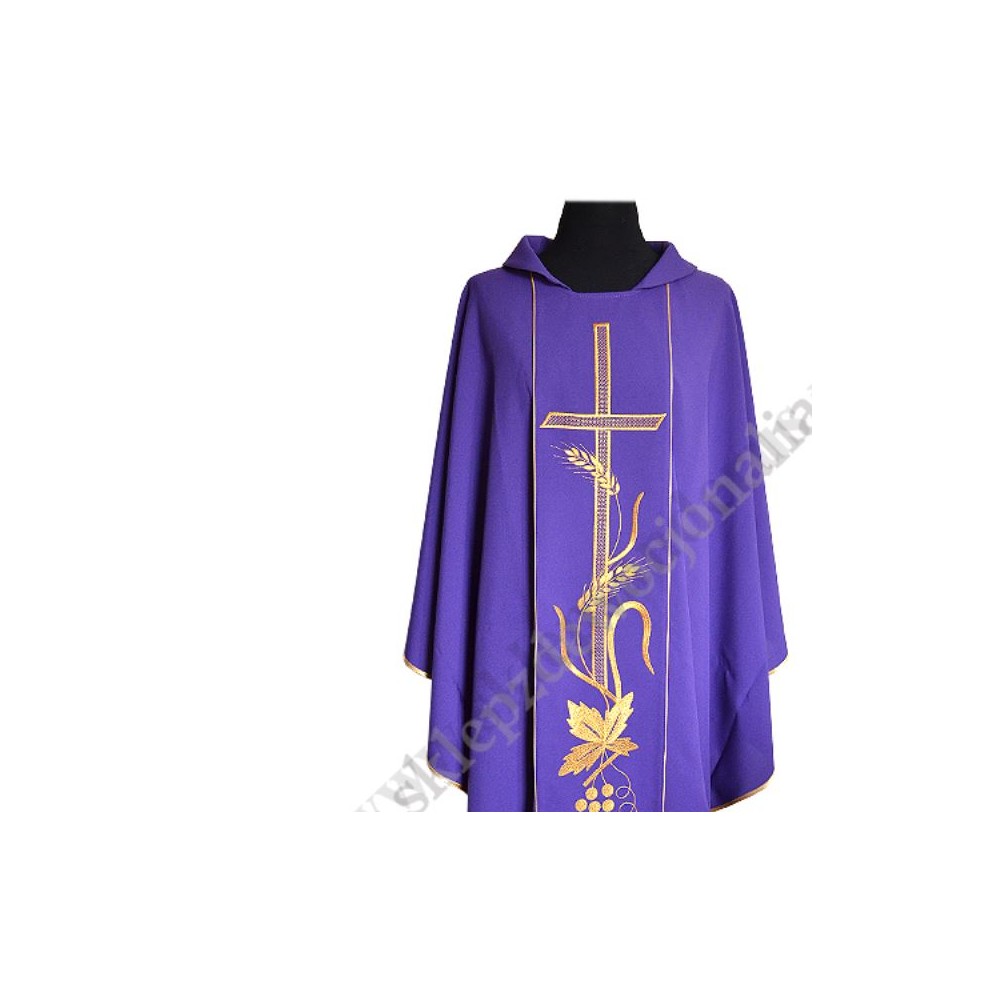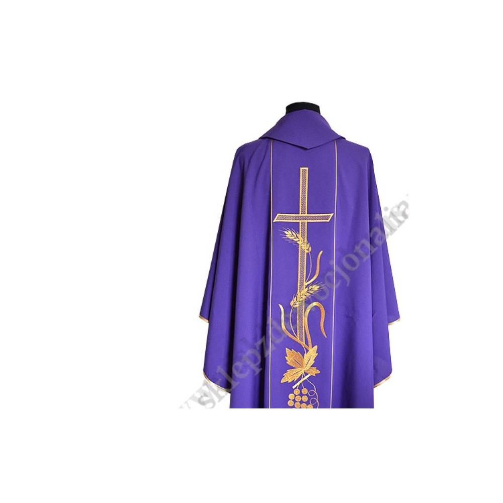 Ornat z pasami haftowanymi komputerowo. Wykonany z lekkiego i przyjemnego w dotyku materiału. W komplecie stuła wewnętrzna.