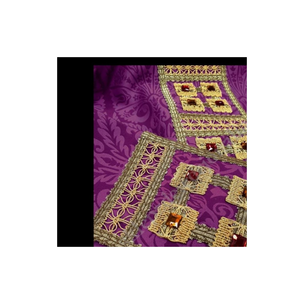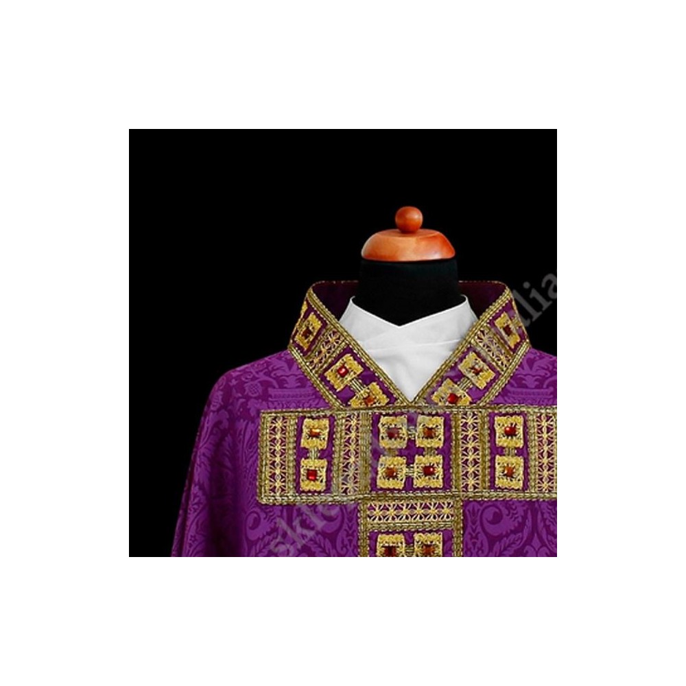 Ornat uszyty z ozdobnej tkaniny, z ręcznie naszywanymi ozdobami z taśm i kamienieni. Stuła wewnętrzna również z bogatymi zdobieniami.
