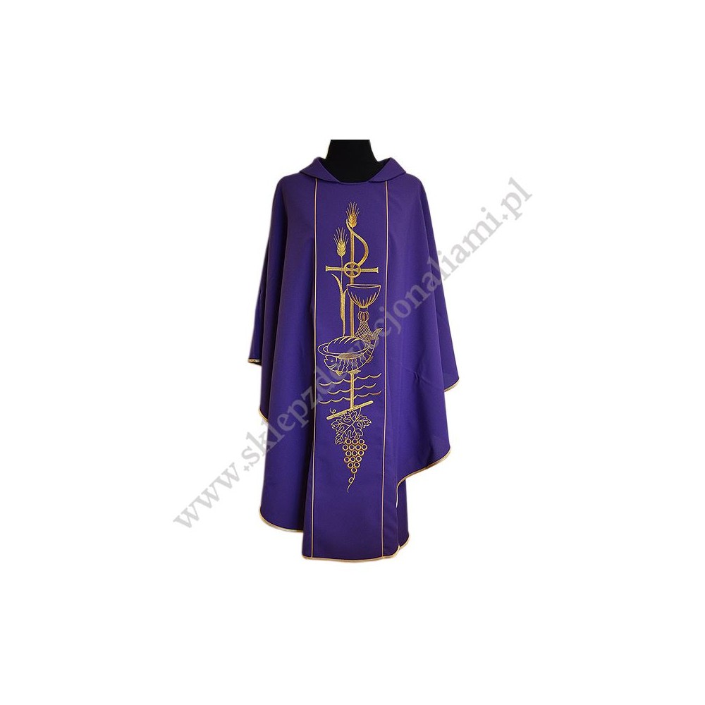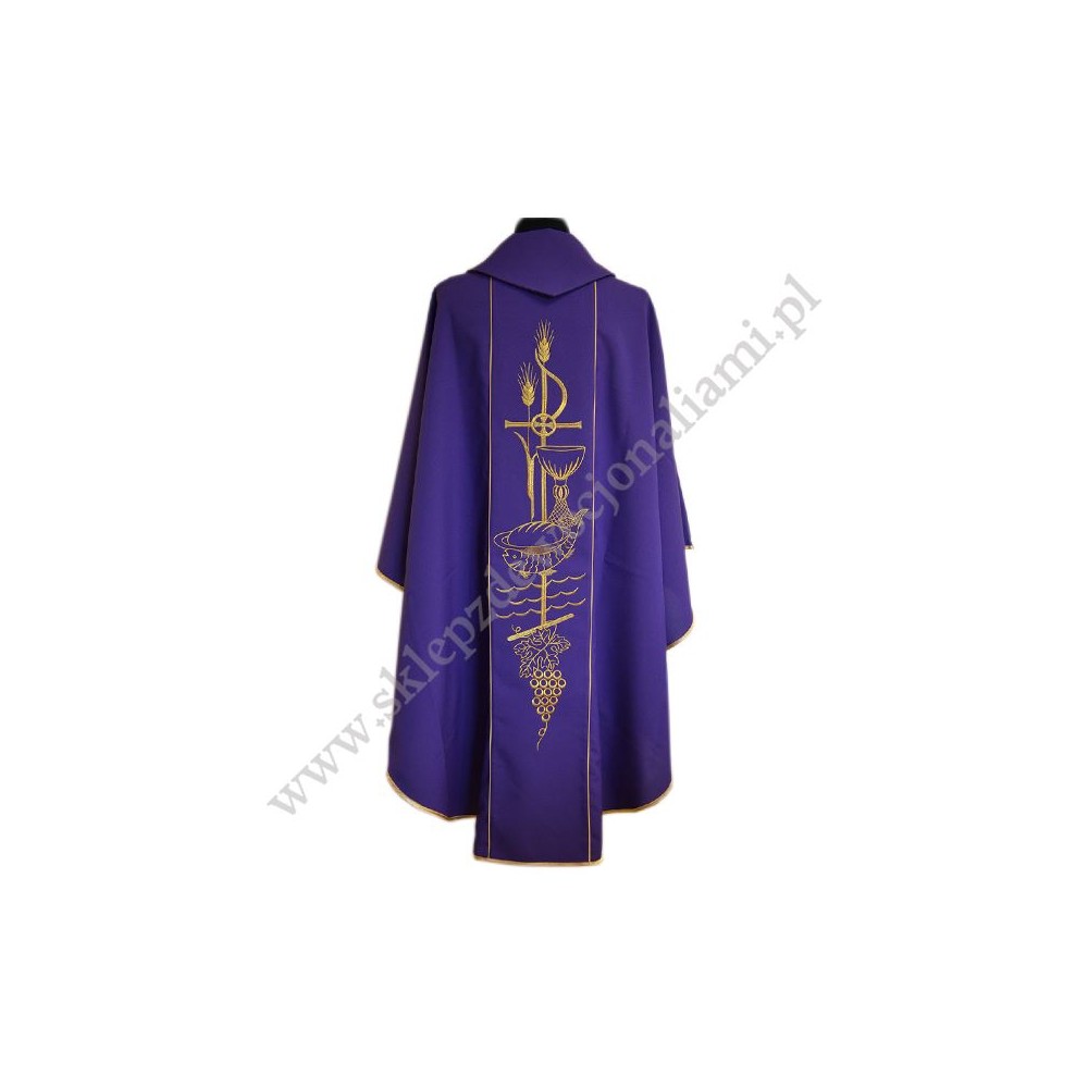 Ornat z pasami haftowanymi komputerowo. Wykonany z lekkiego i przyjemnego w dotyku materiału. W komplecie stuła wewnętrzna.