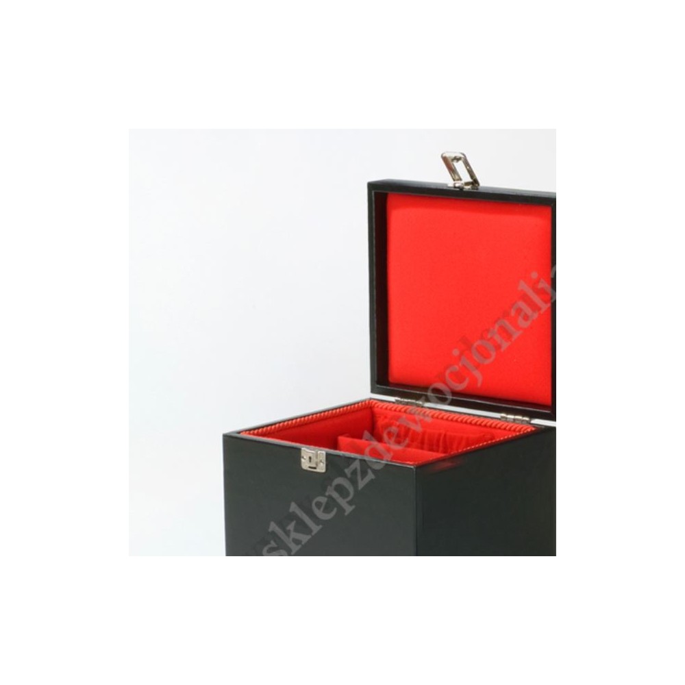 Futerał na kielich mszalny wykonany z drewna, oklejony na zewnątrz skajem, wewnątrz welur.