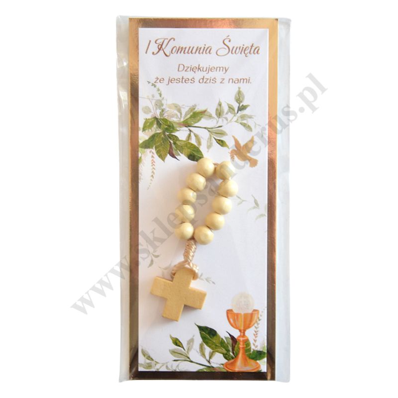 Drewniany dziesiątek różańca w postaci podziękowania za udział w uroczystości I Komunii Świętej.