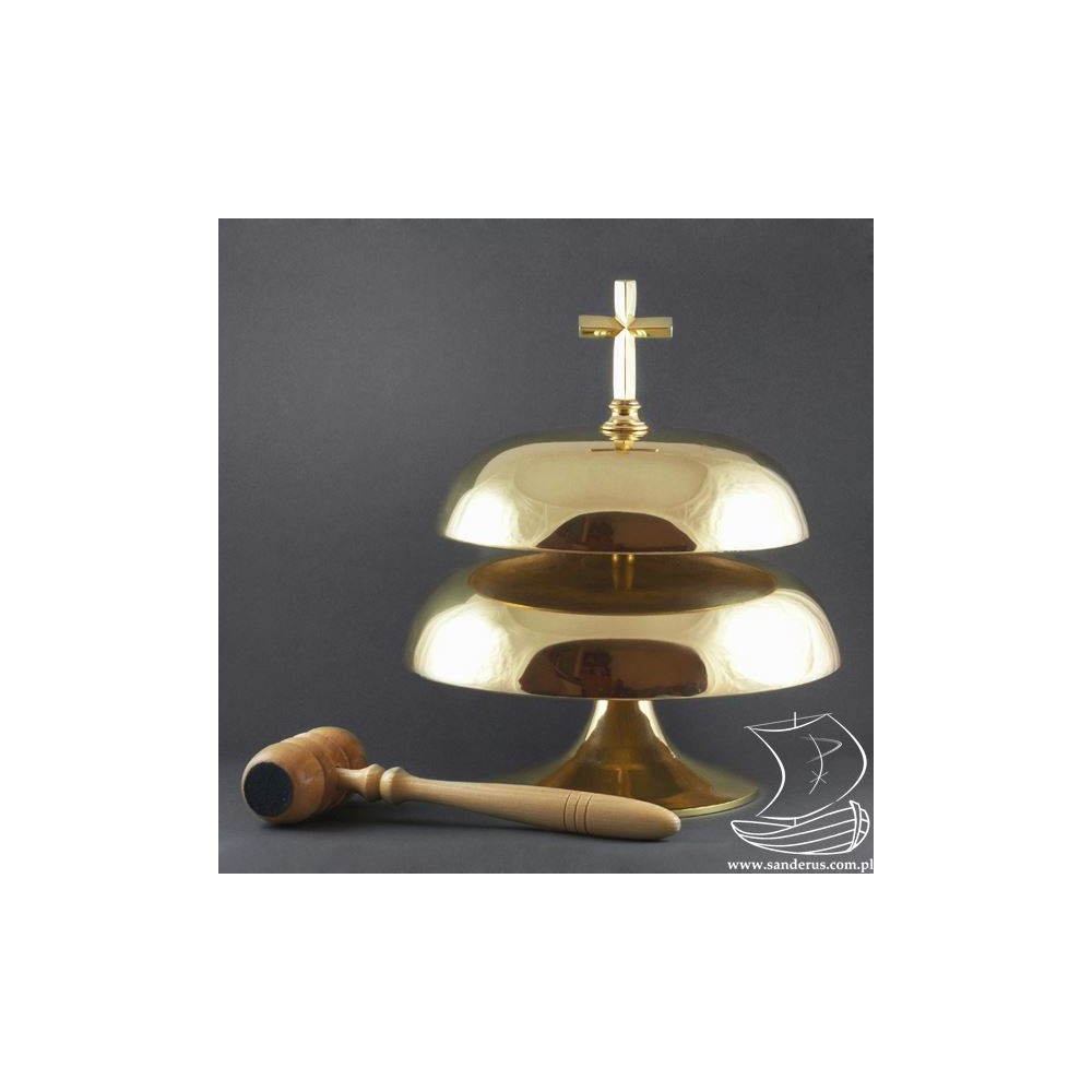 Gong podwójny, mosiężny o średnicach 23 i 26 cm. W komplecie znajduje się drewniana pałka.