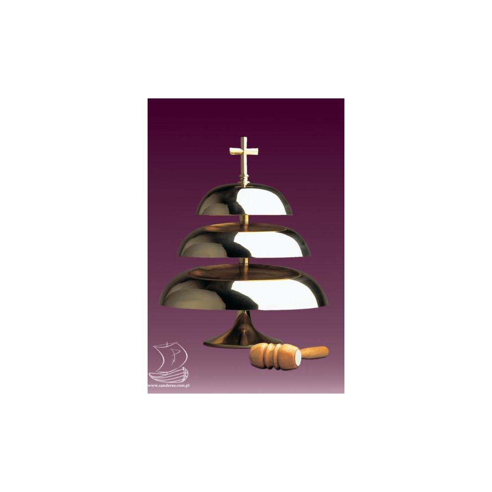 Gong potrójny, mosiężny. Średnica dużego gongu 32cm, średniego 25 cm oraz małego 18 cm. W komplecie znajduje się drewniania pałka.