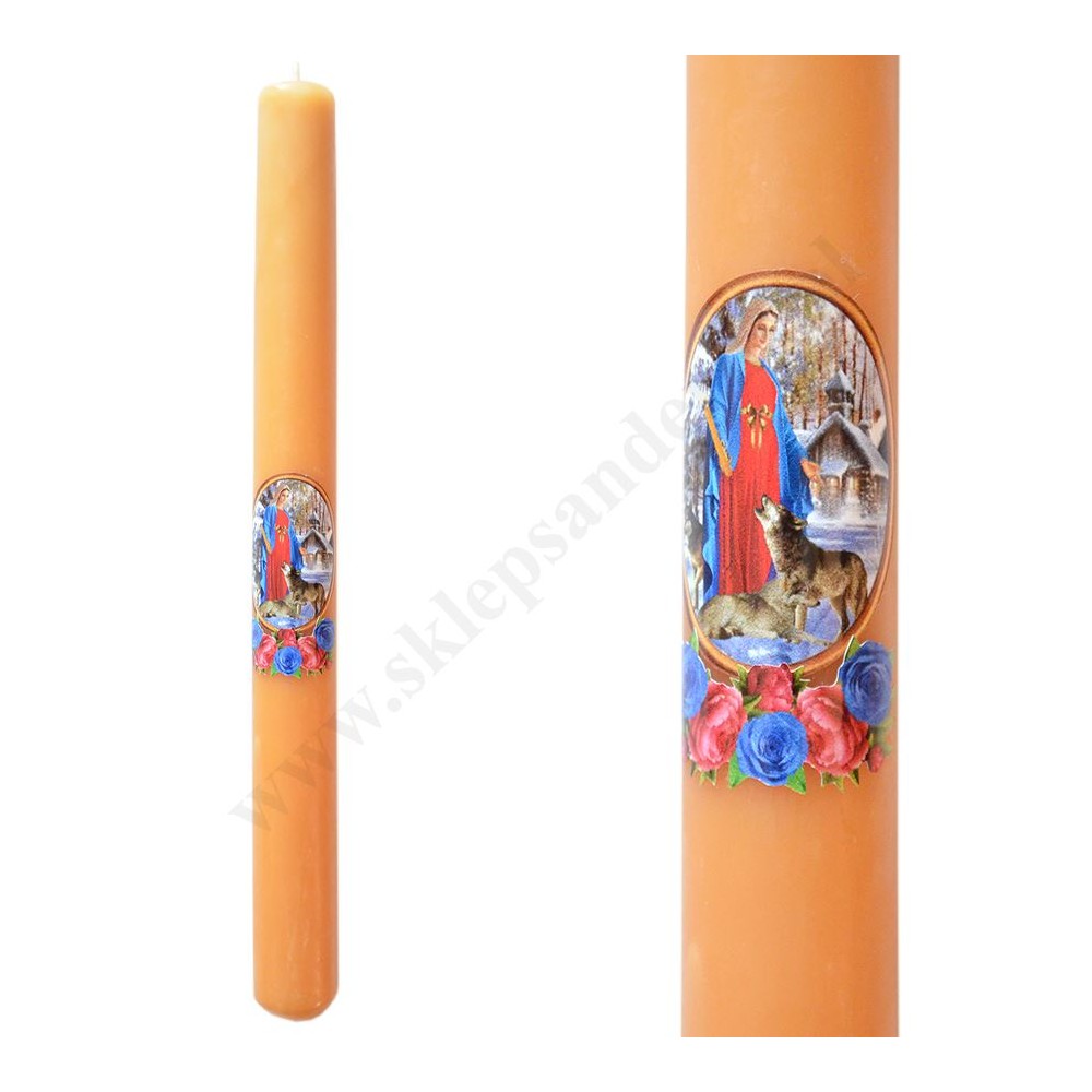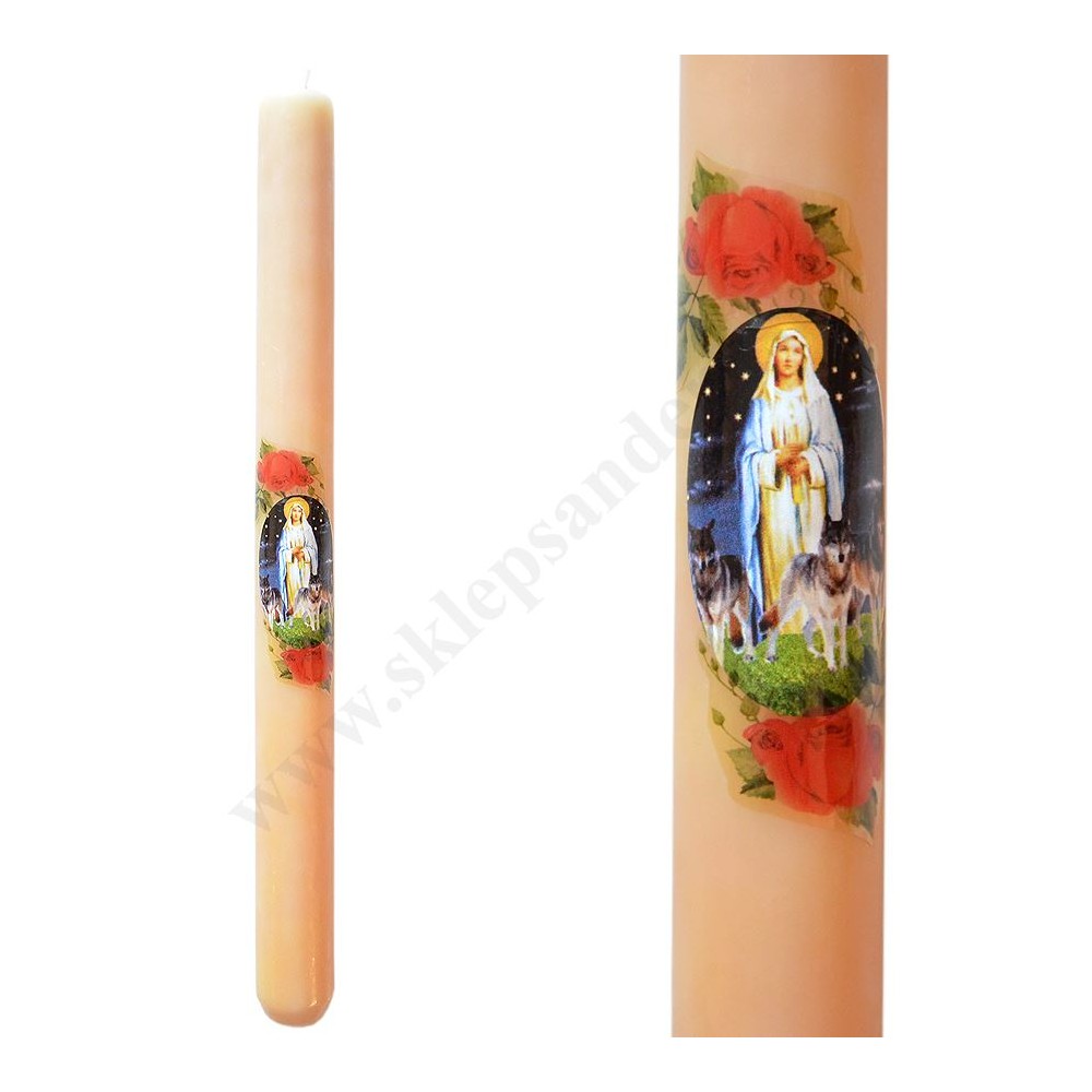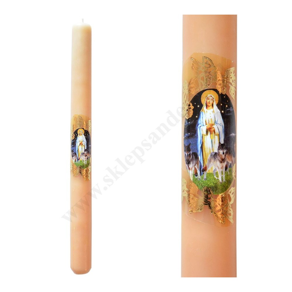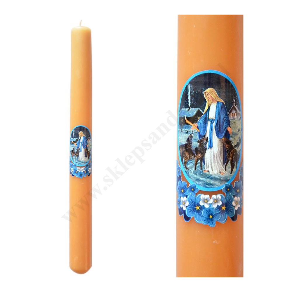 Gromnica oblewana woskiem z ozdobną naklejką Matki Bożej Gromnicznej. Długość świecy 30 cm, średnica świecy 3 cm, sprzedaż w miksie wzorów.