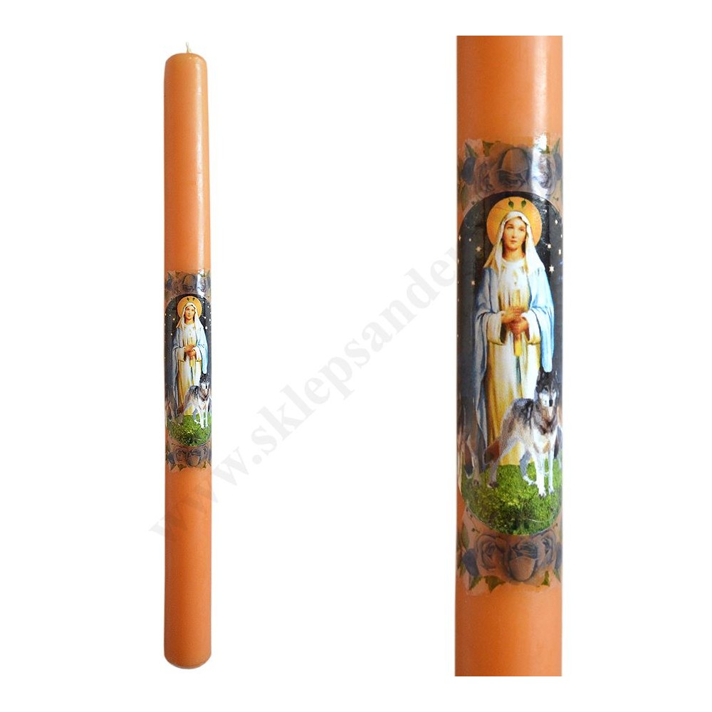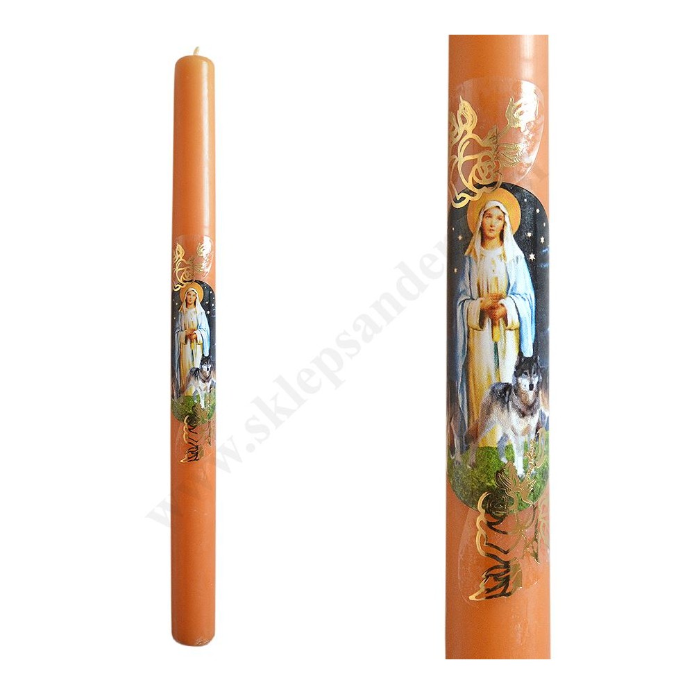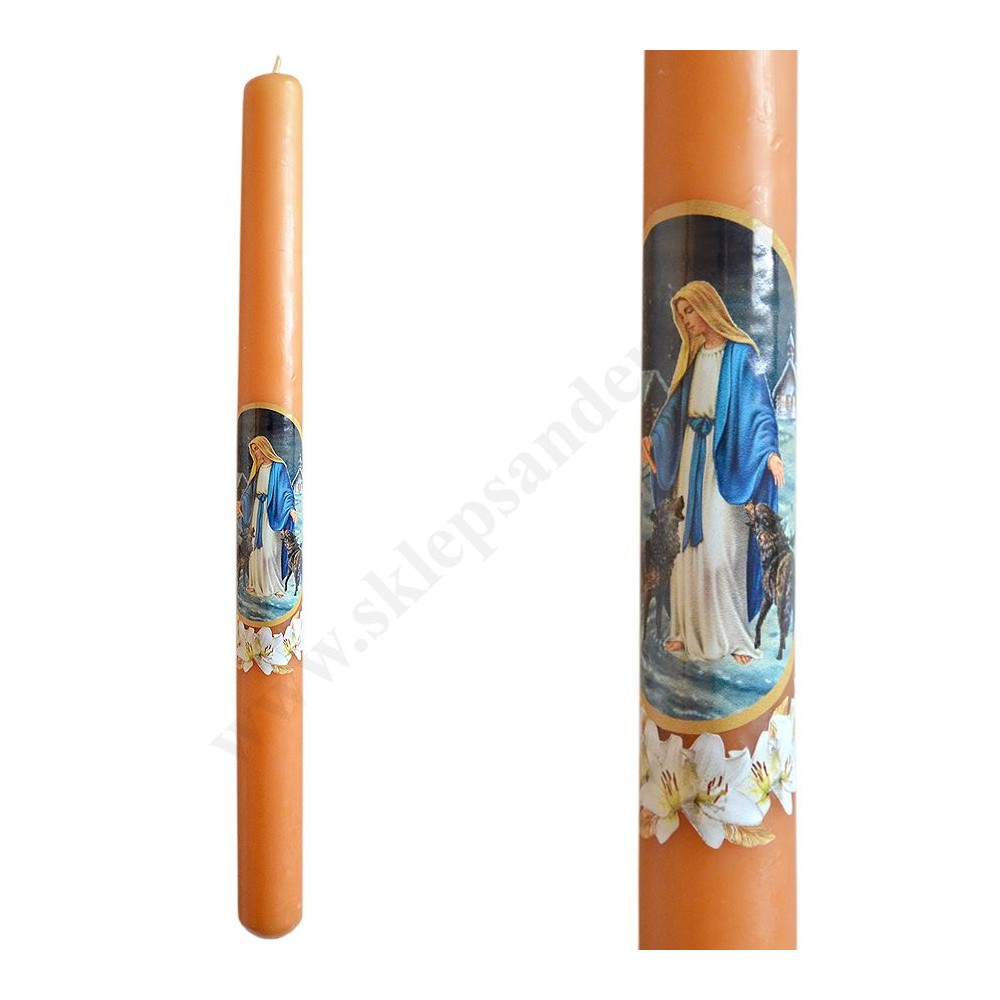 Gromnica oblewana woskiem z ozdobną naklejką Matki Bożej. Długość świecy 40 cm, średnica świecy 3 cm. Sprzedaż w mixie wzorów.