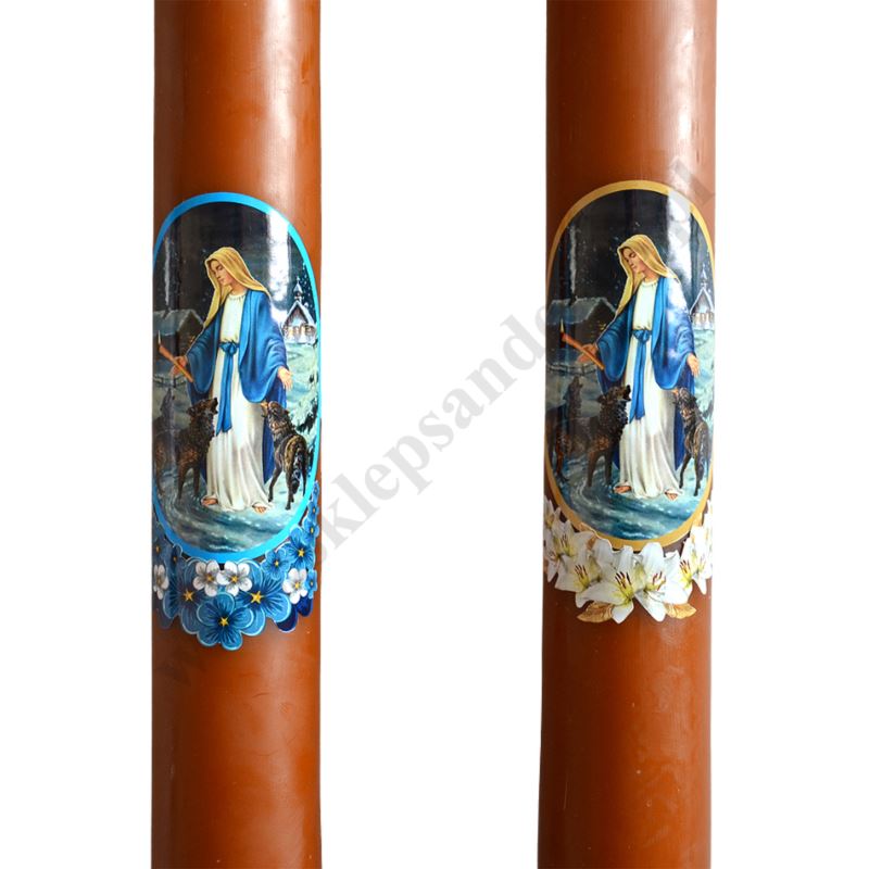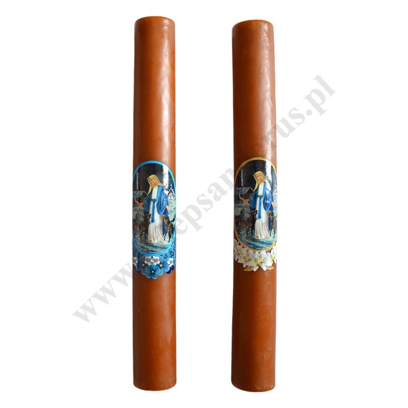 Gromnica parafinowa oblewana woskiem o wysokości 40 cm i średnicy 5 cm, zdobiona naklejką z wizerunkiem Matki Bożej Gromnicznej. Sprzedaż w miksie wzorów.