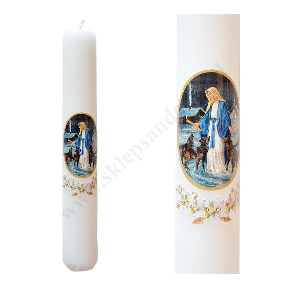 Gromnica parafinowa biała z ozdobną naklejką Matki Bożej. Długość świecy 19 cm, średnica świecy 3 cm. Sprzedaż w mixie wzorów.