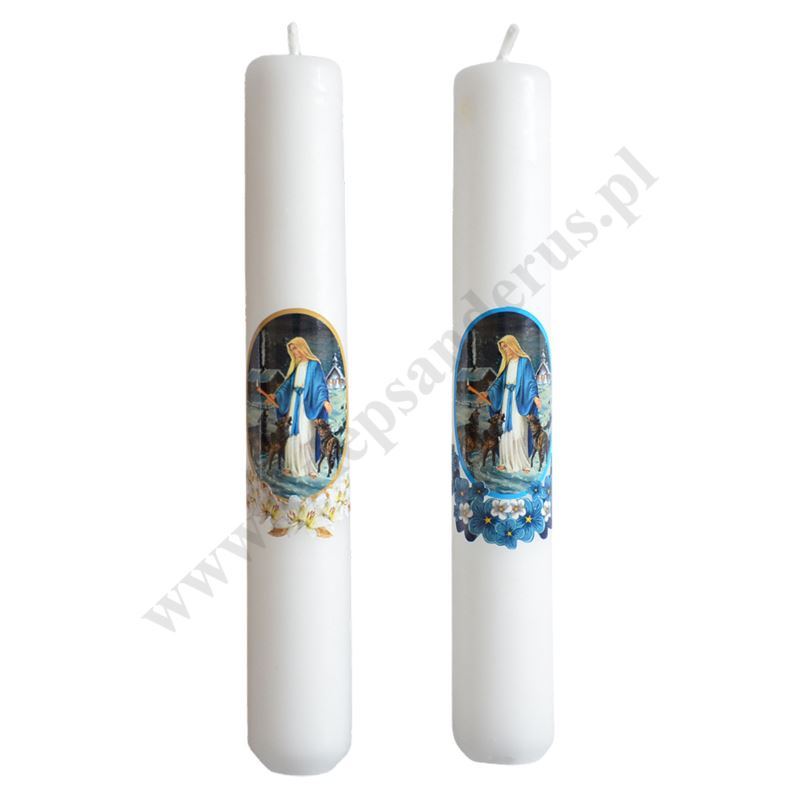 Gromnica parafinowa biała z ozdobną naklejką Matki Bożej. Długość świecy 19 cm, średnica świecy 3 cm. Sprzedaż w mixie wzorów.
