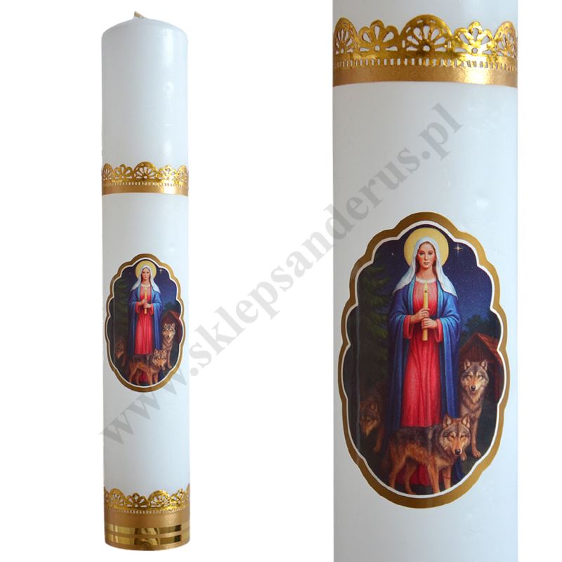 Gromnica parafinowa, biała z ozdobną naklejką Matki Bożej. Długość świecy 27 cm, średnica świecy 4.7 cm