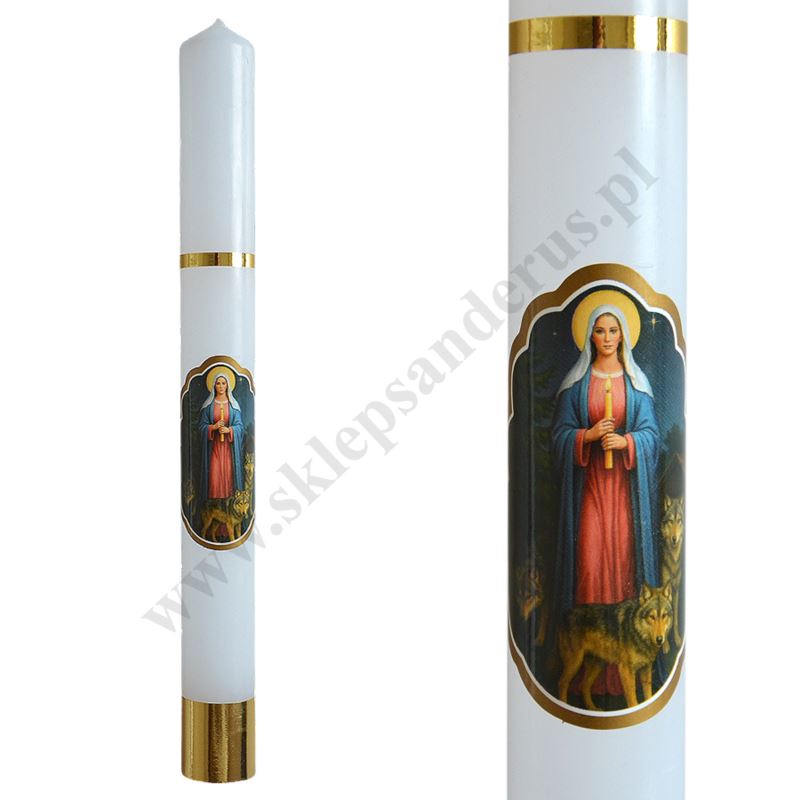 Gromnica parafinowa, biała z ozdobną naklejką Matki Bożej. Długość świecy 28.5 cm, średnica świecy 2.9 cm