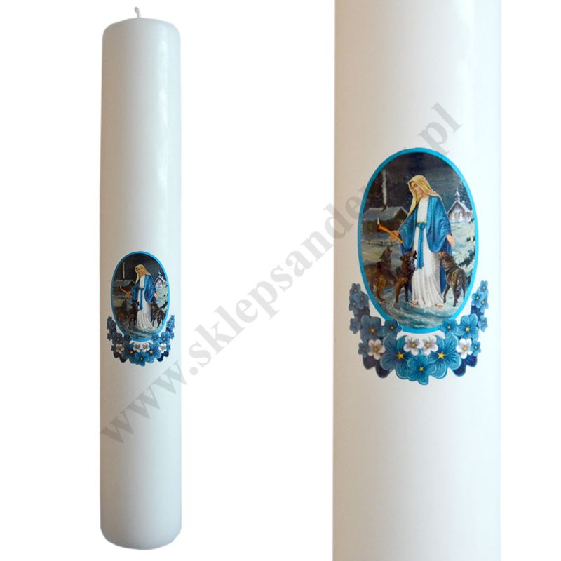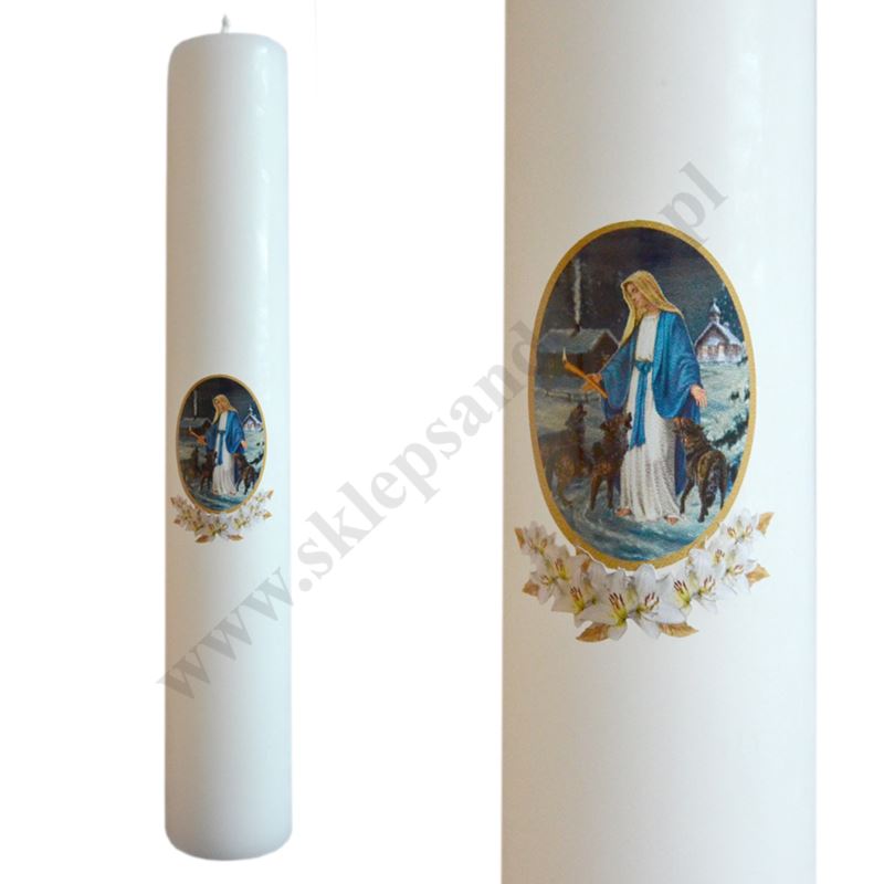 Gromnica parafinowa, biała z ozdobną naklejką Matki Bożej. Długość świecy 30 cm, średnica świecy 5 cm. Sprzedaż w miksie wzorów.