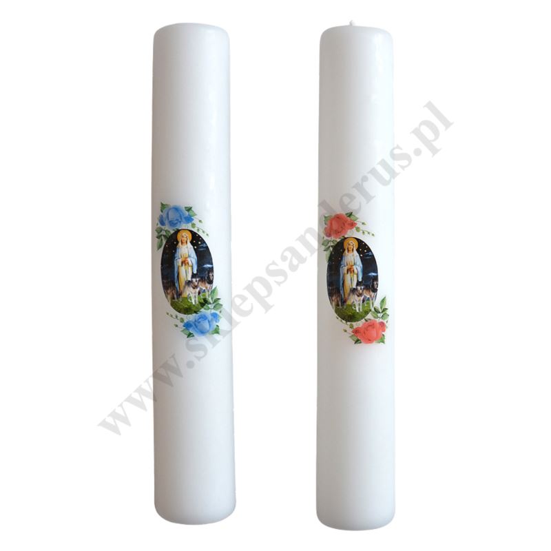 Gromnica parafinowa, biała z ozdobną naklejką Matki Bożej Gromnicznej. Długość świecy30 cm, średnica świecy 5 cm. Sprzedaż w miksie wzorów.