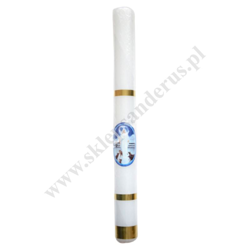 Gromnica parafinowa, biała z ozdobną naklejką Matki Bożej. Długość świecy 40 cm, średnica świecy 4 cm