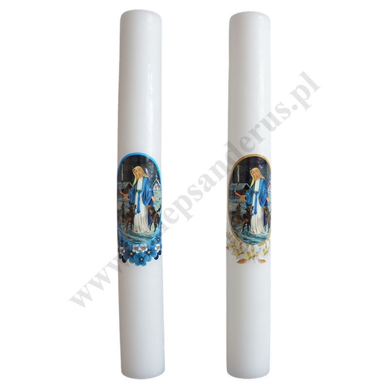 Gromnica parafinowa biała o wysokości 40 cm i średnicy 5 cm, zdobiona naklejką z wizerunkiem Matki Bożej Gromnicznej. Sprzedaż w miksie wzorów.