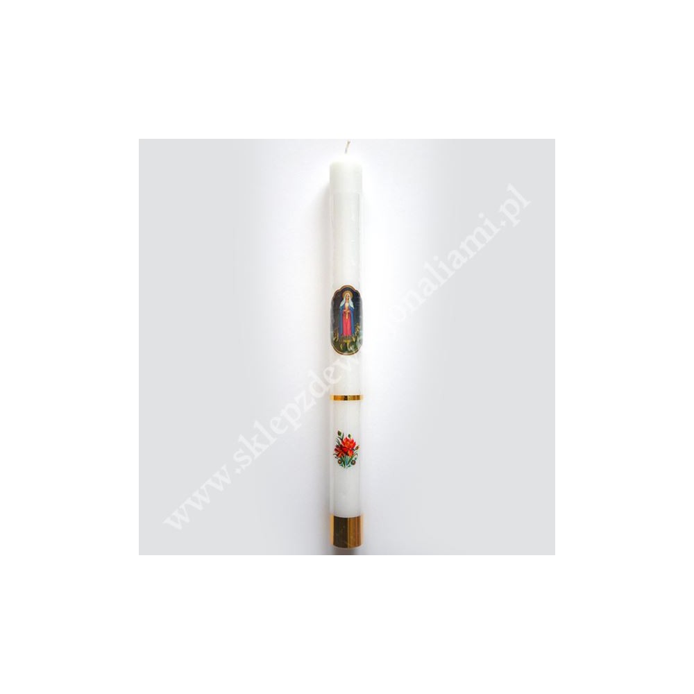 Gromnica parafinowa, biała z ozdobną naklejką Matki Bożej. Długość świecy 41 cm, średnica świecy 3.6 cm