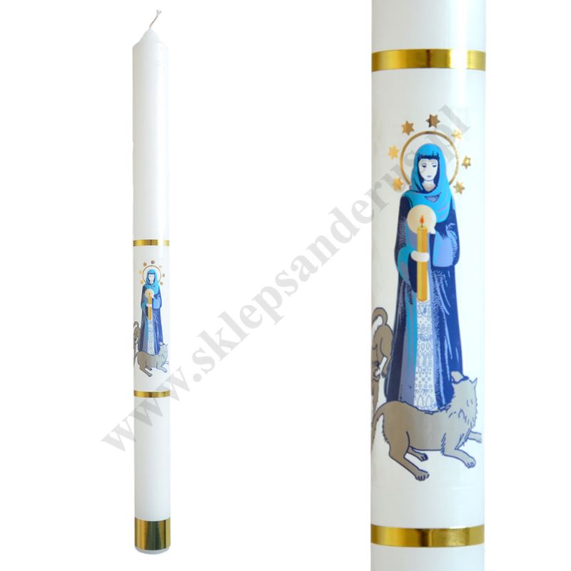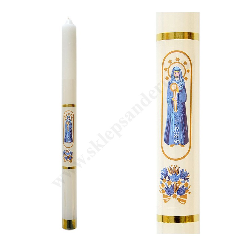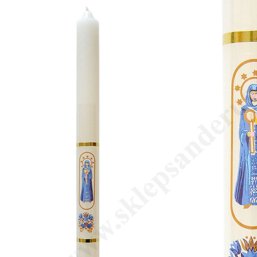 Gromnica parafinowa biała, zdobiona naklejką z wizerunkiem Matki Bożej Gromnicznej. Wysokość świecy 43 cm, średnica świecy 3 cm.