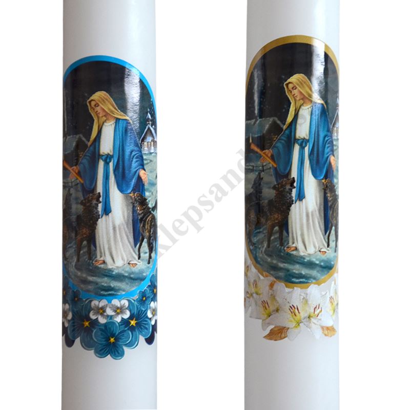 Świeca parafinowa biała o wysokości 45 cm i średnicy 4 cm zdobiona naklejką przedstawiającą Matkę Bożą Gromniczną. Sprzedaż w miksie wzorów.